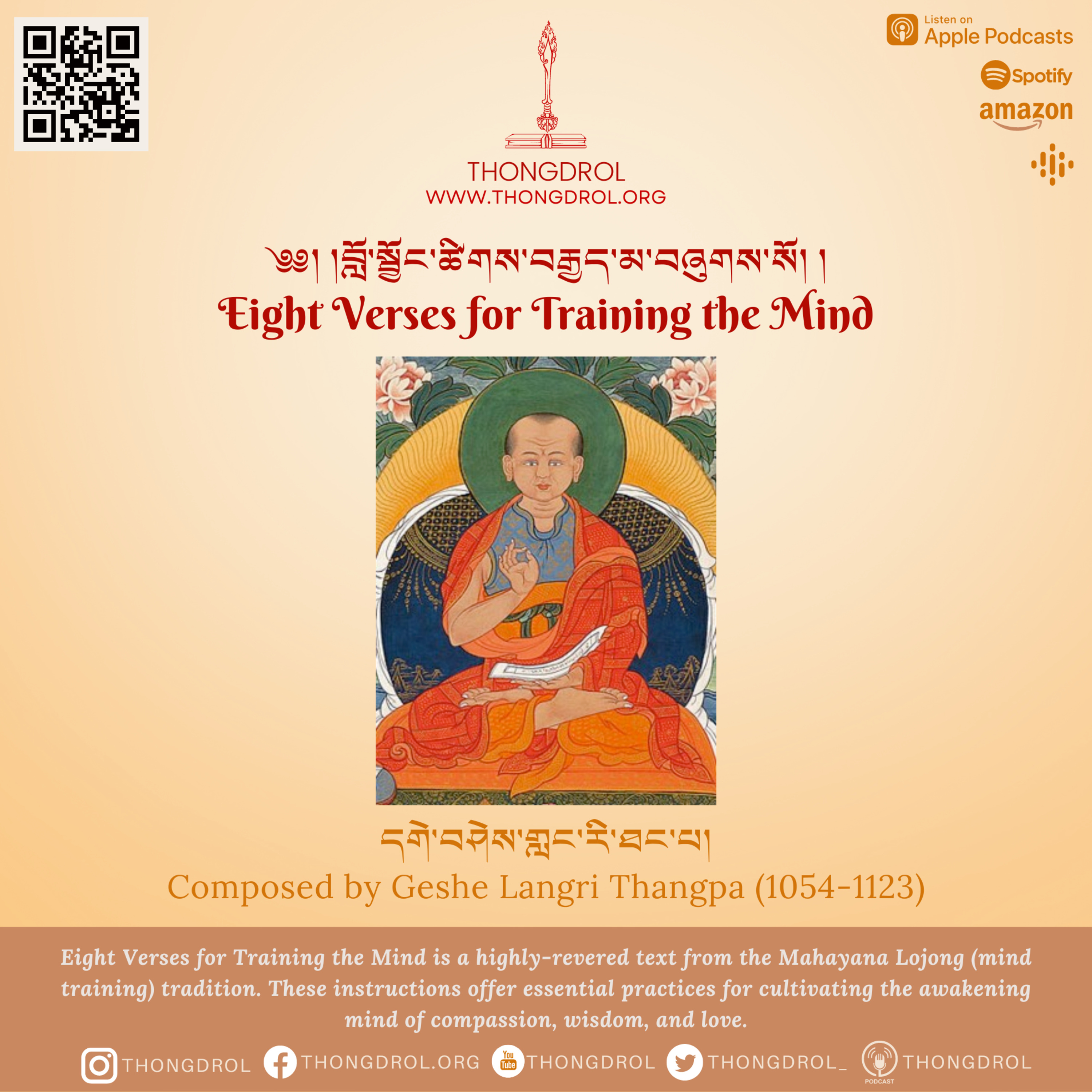 Composed by the Tibetan Buddhist Master Langri Tangpa (1054-1123), Eight Verses for Training the Mind is a highly-revered text from the Mahayana Lojong (mind training) tradition. These instructions offer essential practices for cultivating the awakening mind of compassion, wisdom, and love. This eight-verse lojong enshrines the very heart of Dharma, revealing the true essence of the Mahayana path to liberation. Even a single line of this practice can be seen as encapsulating the entire teaching of the Buddha. For even a single statement of this mind training practice has the incredible power to help us subdue our self-oriented behavior and mental afflictions.