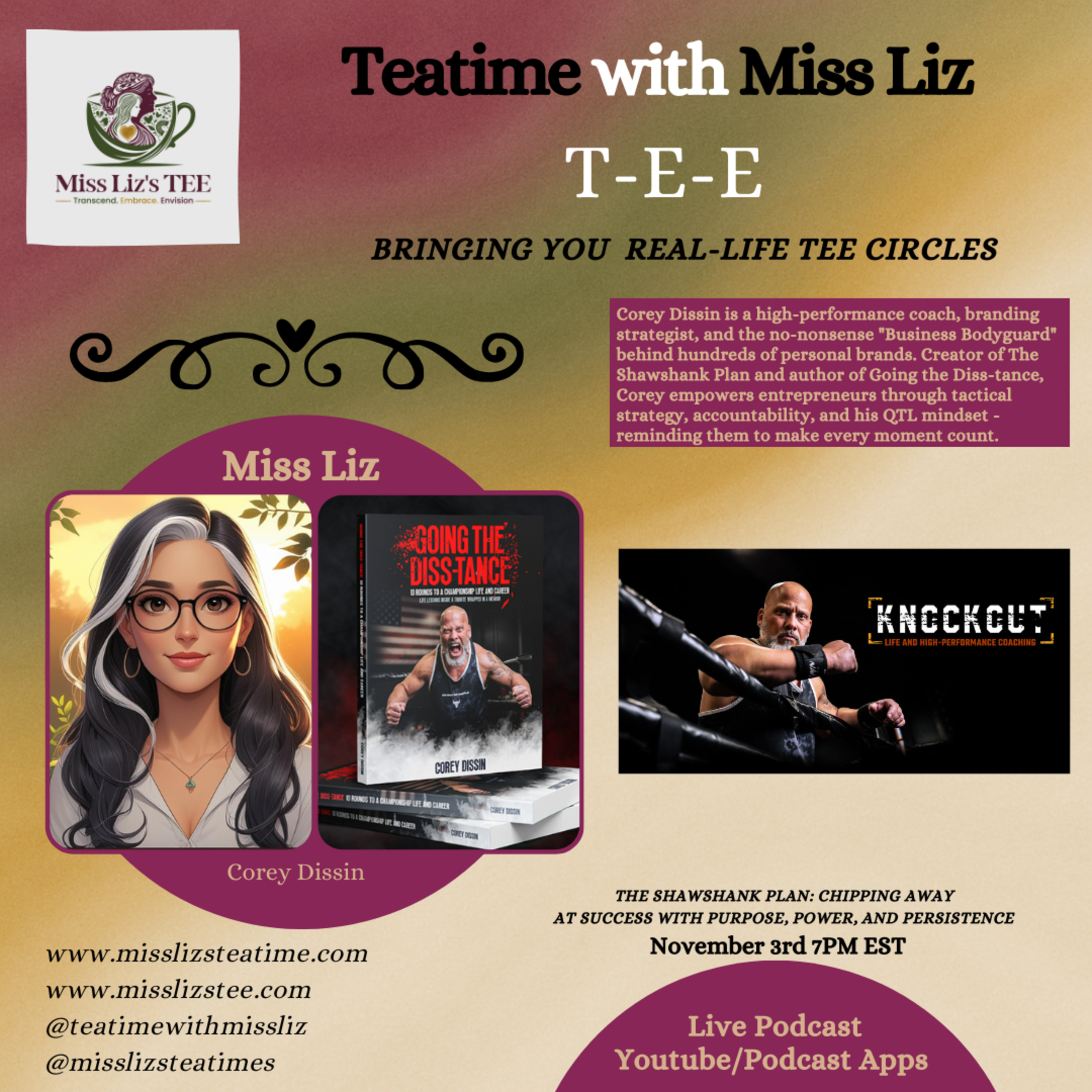 A single, instead, Miss Liz welcomes Corey Dissin, the no-nonsense Business Bodyguard, for a powerhouse Tea Time on mindset, consistency, and the discipline behind true success. Together, they’ll dive into his renowned Shawshank Plan — a system for transforming massive goals into daily actions — and discuss how his philosophy of QTL (Quality Time Left) reshapes how we approach business, purpose, and life itself. Description: Overcome. In this empowering Teatime, Corey Dissin will bring decades of experience in media, marketing, and leadership to the table. Known as the Business Bodyguard, Corey has helped hundreds of entrepreneurs and personal brands break through fear, organize chaos, and establish sustainable systems that scale. With his signature framework — The Shawshank Plan — Corey teaches that success isn’t a single, big leap, but rather the result of showing up every day and chipping away at your vision until it becomes a reality. His mindset of QTL (Quality Time Left) challenges entrepreneurs to stop wasting time on distractions and start using every moment with intention. Through Tactical Empowerment Accountability, Corey blends actionable strategy with tough love — empowering individuals to take consistent, measurable steps toward their goals while holding them accountable to see it through. Whether you’re stuck in the walls of fear or ready to break through to your next level, Corey’s mission is clear: Work hard. Work smart. Make it count. Introduction