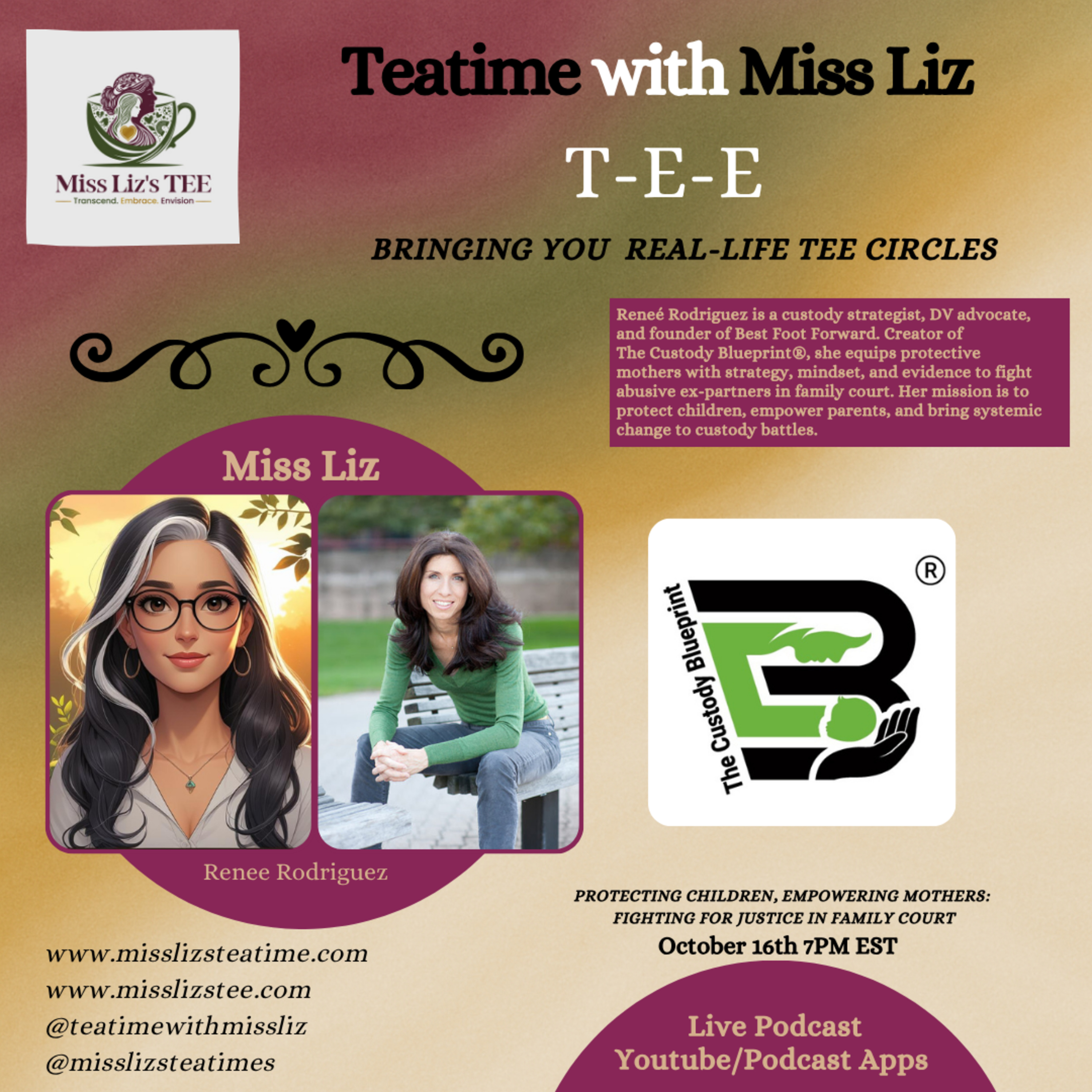 LIVE on Miss Liz’s Platforms TITLEMOTHER OF CUSTODY: Protecting Children, Empowering Mothers — Fighting for Justice in Family Court TAGLINE“Because no mother should have to fight alone for the right to protect her child.” TOPIC Advocate and author Renee Rodriguez shares her courageous fight for justice in the family court system. Through her Mother of Custody movement, she sheds light on systemic failures, emotional resilience, and the strength it takes for mothers to rise, reclaim their voices, and protect their children through truth and awareness. 50-WORD BIORenee Rodriguez is an author, advocate, and founder of Mother of Custody, a movement amplifying the voices of mothers navigating family court battles. She champions reform, truth, and empowerment—helping women turn pain into purpose while protecting the innocence and safety of children through advocacy and awareness. INTRODUCTION (Miss Liz’s Opening Script)At the teatime table, I welcome Renee Rodriguez, a powerful voice for justice, healing, and change. As the founder of Mother of Custody, Renee has taken her personal journey through the family court system and turned it into a movement for mothers and children everywhere. Her story reminds us that silence protects no one—truth, courage, and compassion do.” CLOSING SUMMARY (Miss Liz’s Closing Words)Teatime will pour courage and compassion into one cup. Renee reminded us that love doesn’t give up—it rises. Through every courtroom and every story of pain, there is a mother’s strength reshaping the system and lighting the path for others. Her message is simple yet powerful: when one mother stands, the world begins to listen.”#TeatimeWithMissLiz #MissLizTEE #ReneeRodriguez #MotherOfCustody #JusticeForFamilies #ProtectChildren #EmpowerMothers #FamilyCourtReform #HealingThroughStories #TraumaToTriumph #VoicesThatHeal #OneCupAtATime
