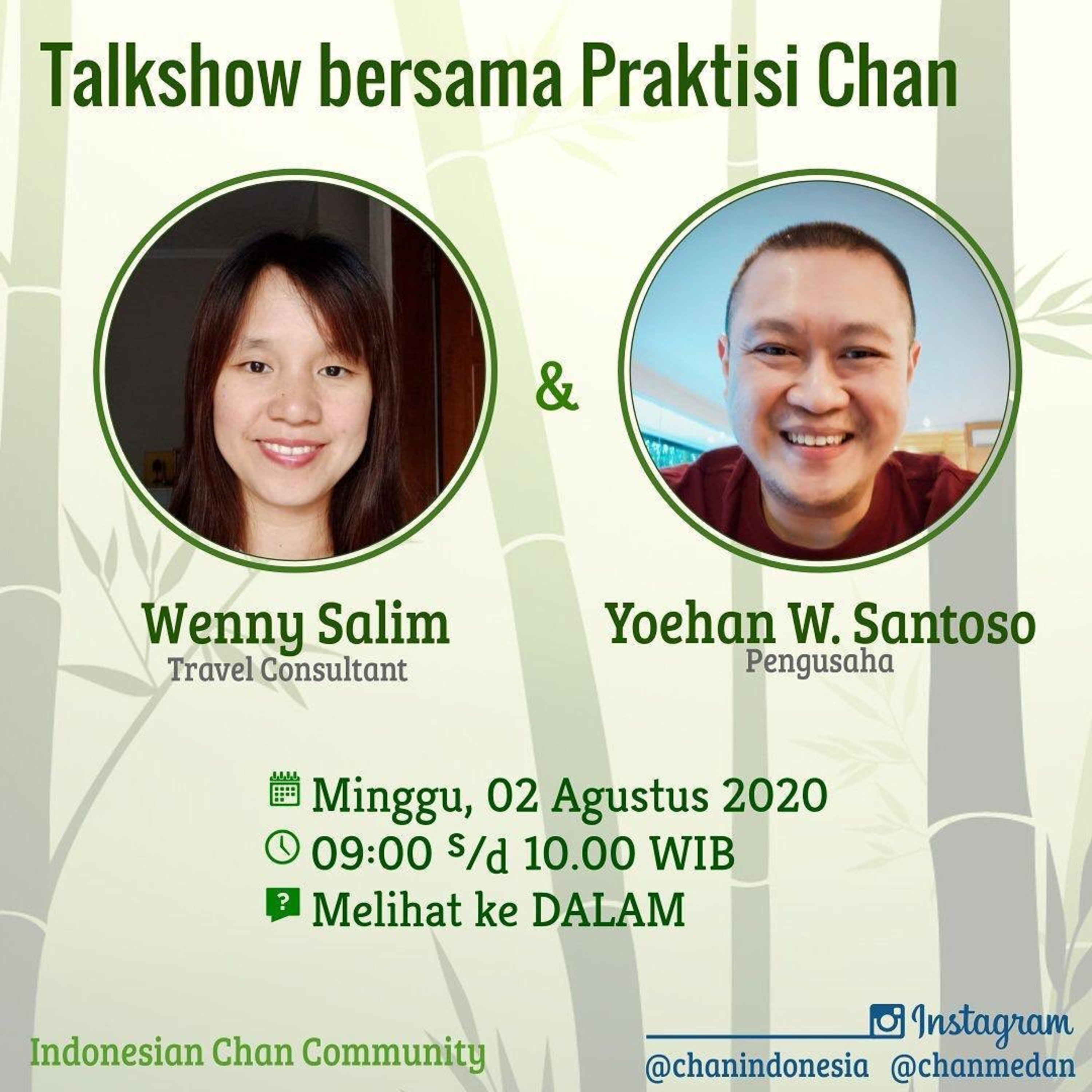 Mari kita ikuti talkshow untuk membahas lebih lanjut “Melihat ke Dalam” ini bersama moderator kita yang juga praktisi Chan, yaitu: