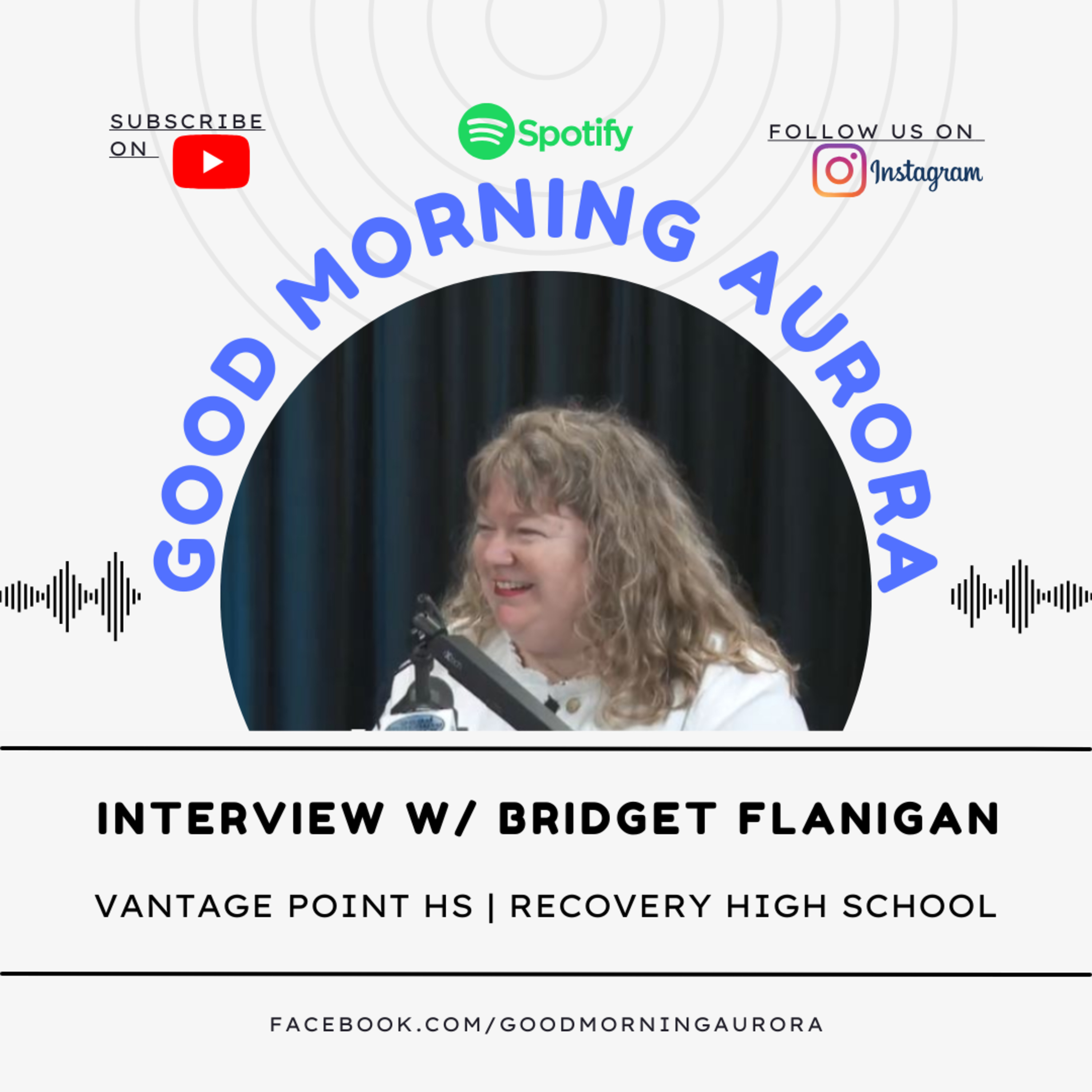 Good morning friends and neighbors! Today Aurora's first news channel is excited to welcome Bridget Flanigan to our program. Bridget is one of the founders of the nonprofit organization Vantage Point HS, which seeks to open a recovery High School for adolescents in Aurora. This morning we will be talking about recovery, substance abuse and what we can do to support those in need of services. Bridget will be speaking specifically about 'Recovery High School' and what this platform can offer.