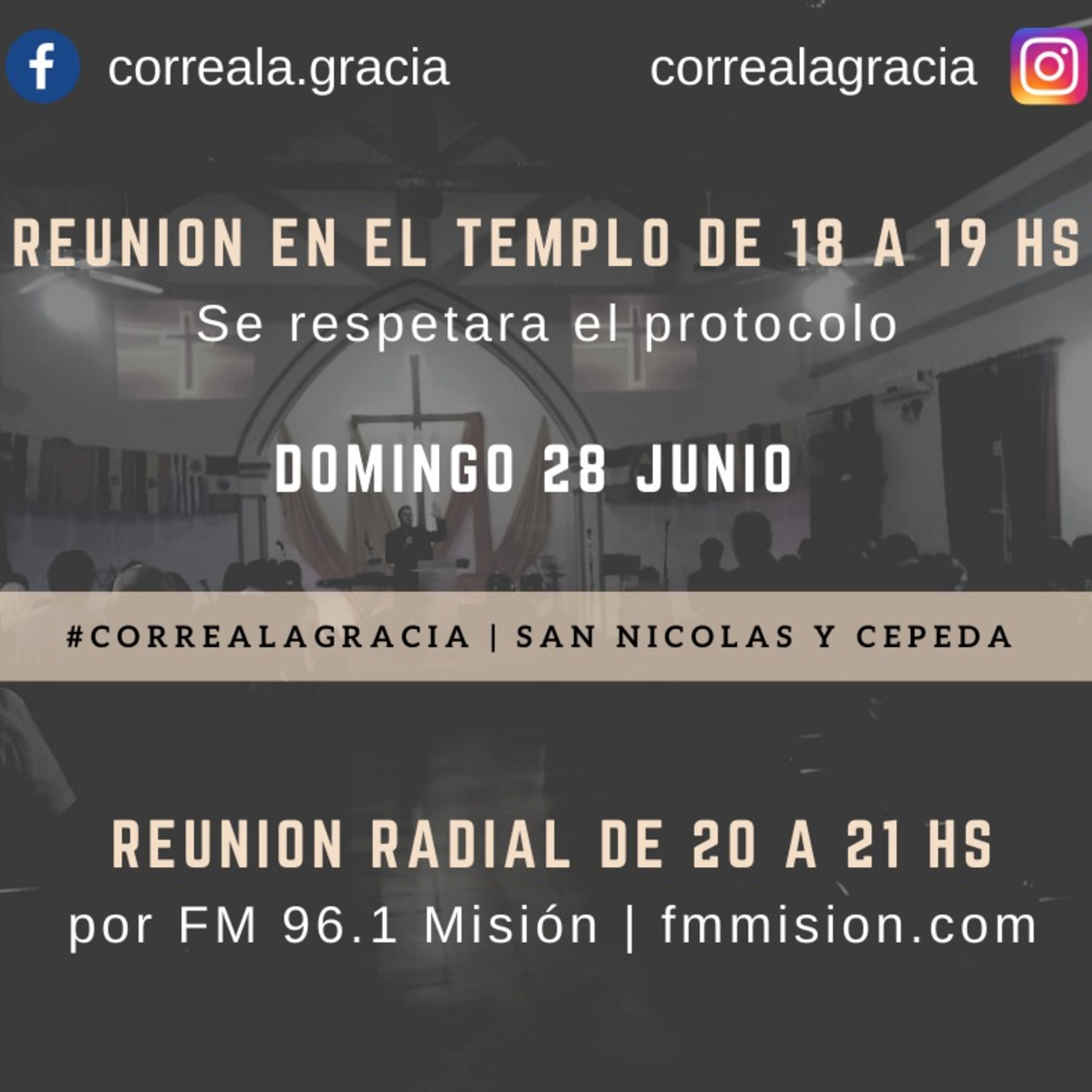 Aquí podes escuchar el culto de la iglesia #CorrealaGracia del día domingo 28 de junio a las 8 pm por la FM Misión 96.1 y fmmision.com