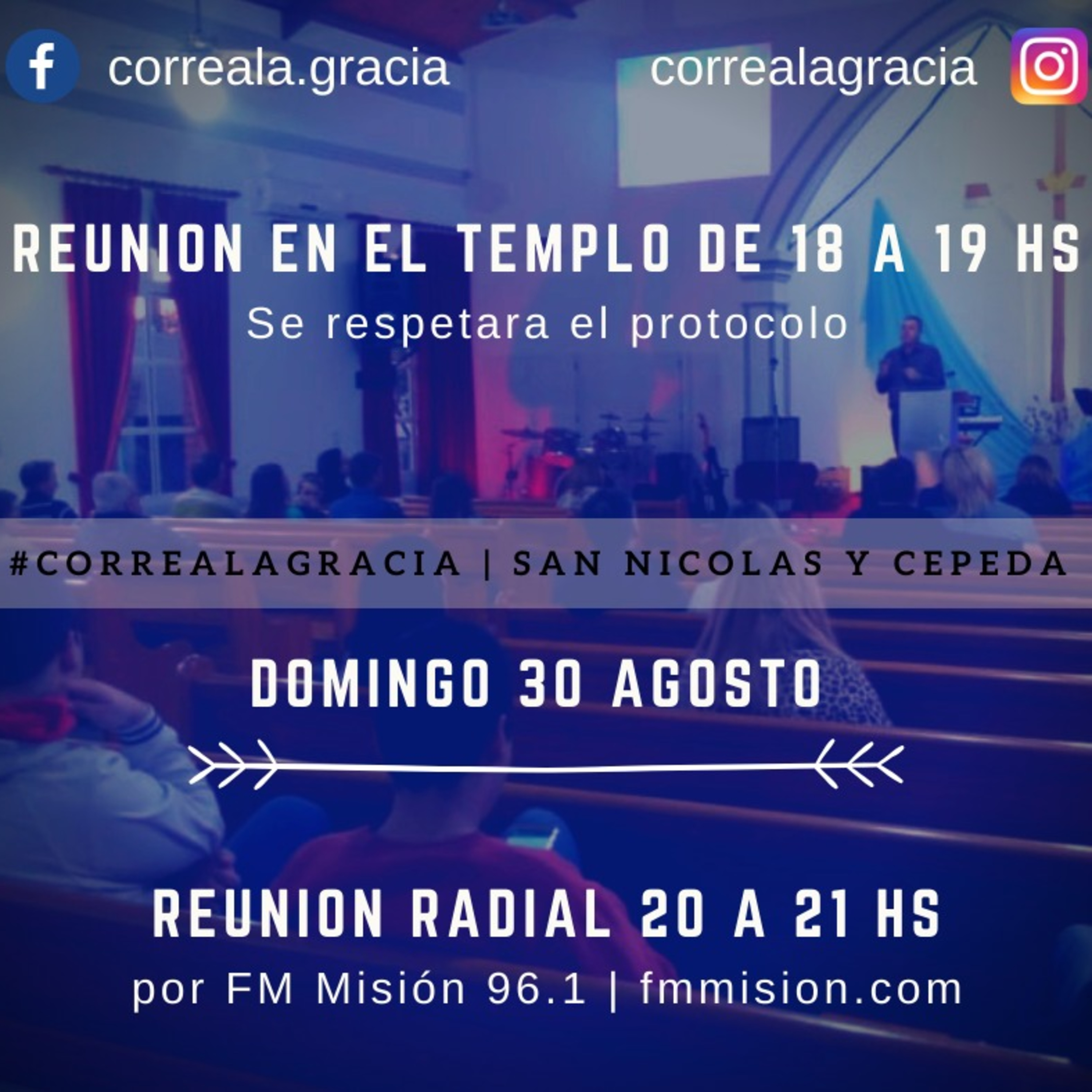 Aquí podes escuchar el culto de la iglesia #CorrealaGracia del día domingo 30 de agosto a las 8 pm por la FM Misión 96.1 y fmmision.com