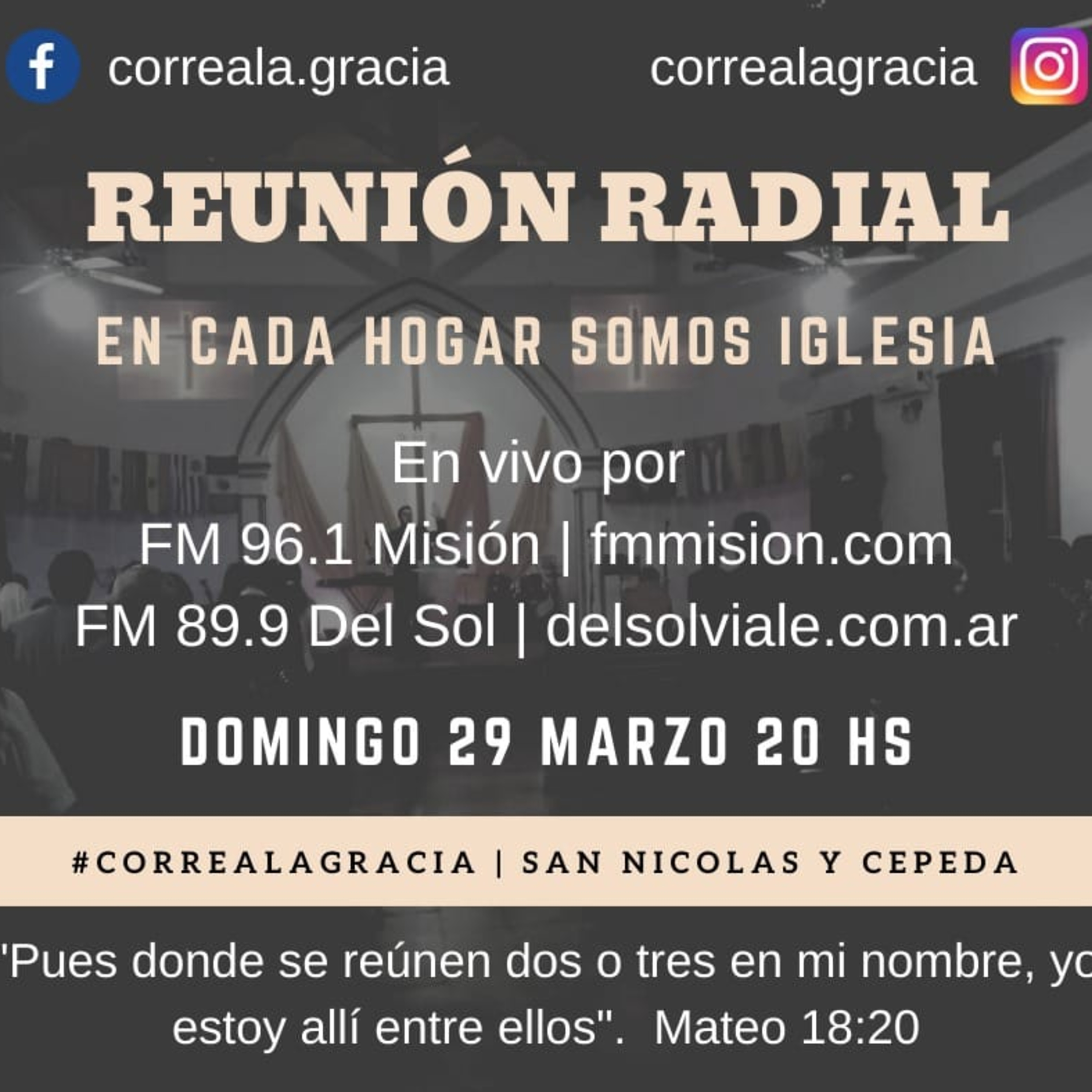 Aquí podes escuchar el culto de la iglesia #CorrealaGracia del día domingo 29 de marzo a las 8 p. m. por la FM Misión 96.1 y fmmision.com Pastor Sergio Gillig.