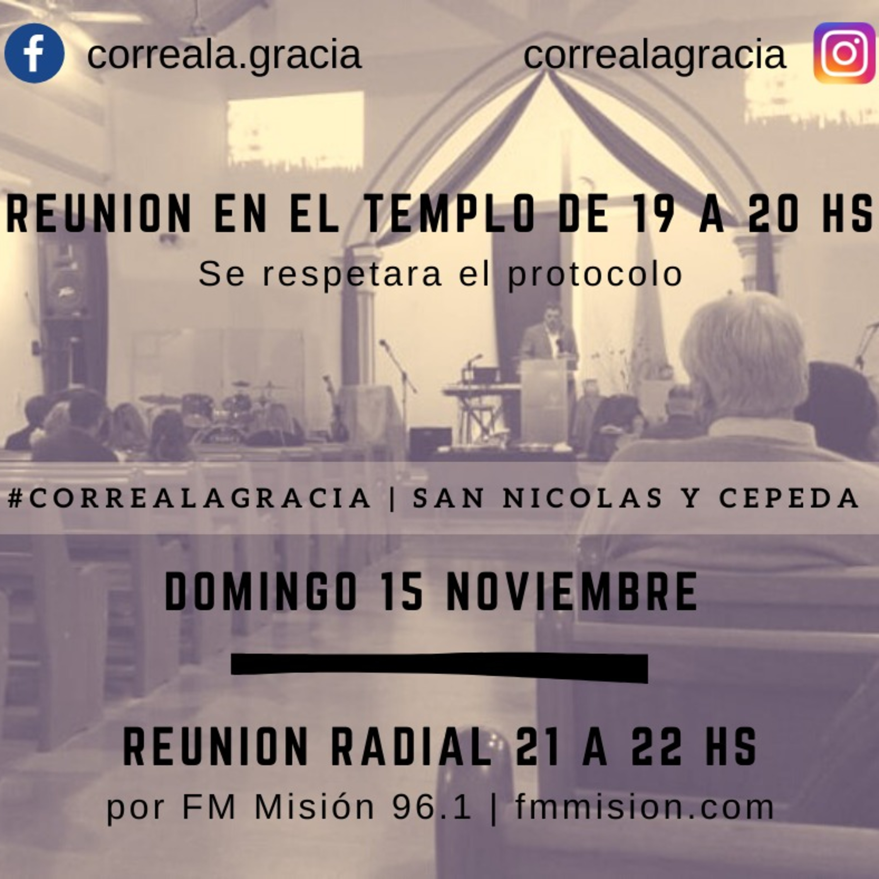 Aquí podes escuchar el culto de la iglesia #CorrealaGracia del día domingo 15 de noviembre a las 9 pm por la FM Misión 96.1 y fmmision.com