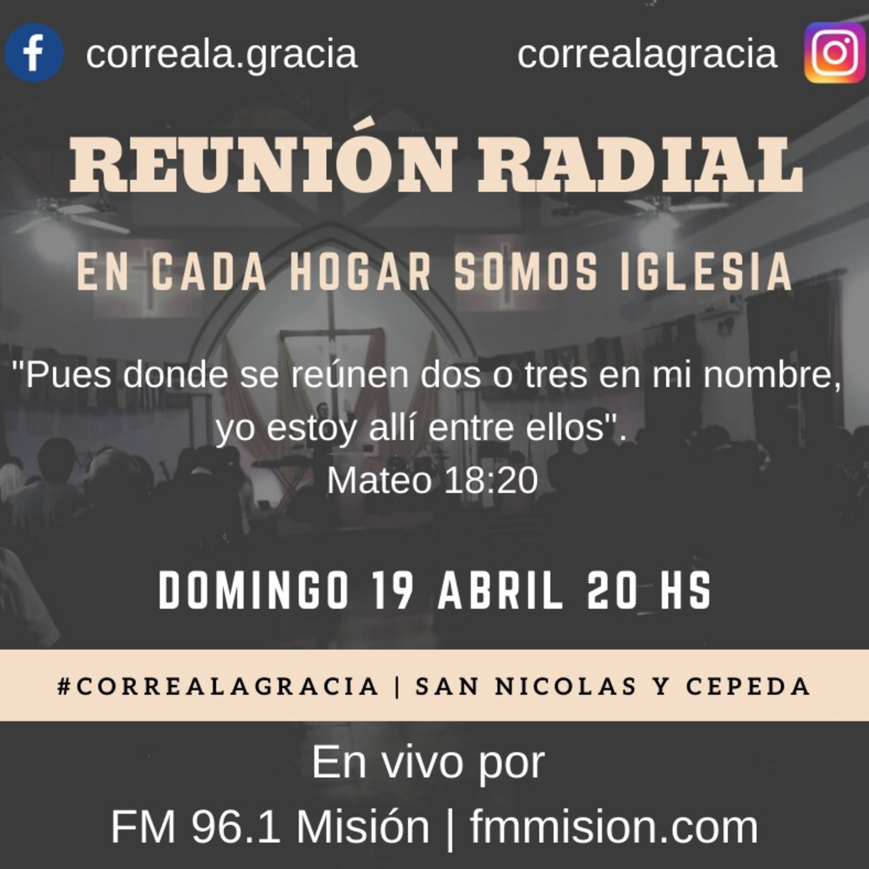Aquí podes escuchar el culto de la iglesia #CorrealaGracia del día domingo 19 de abril a las 8 p. m. por la FM Misión 96.1 y fmmision.com Pastor Sergio Gillig.