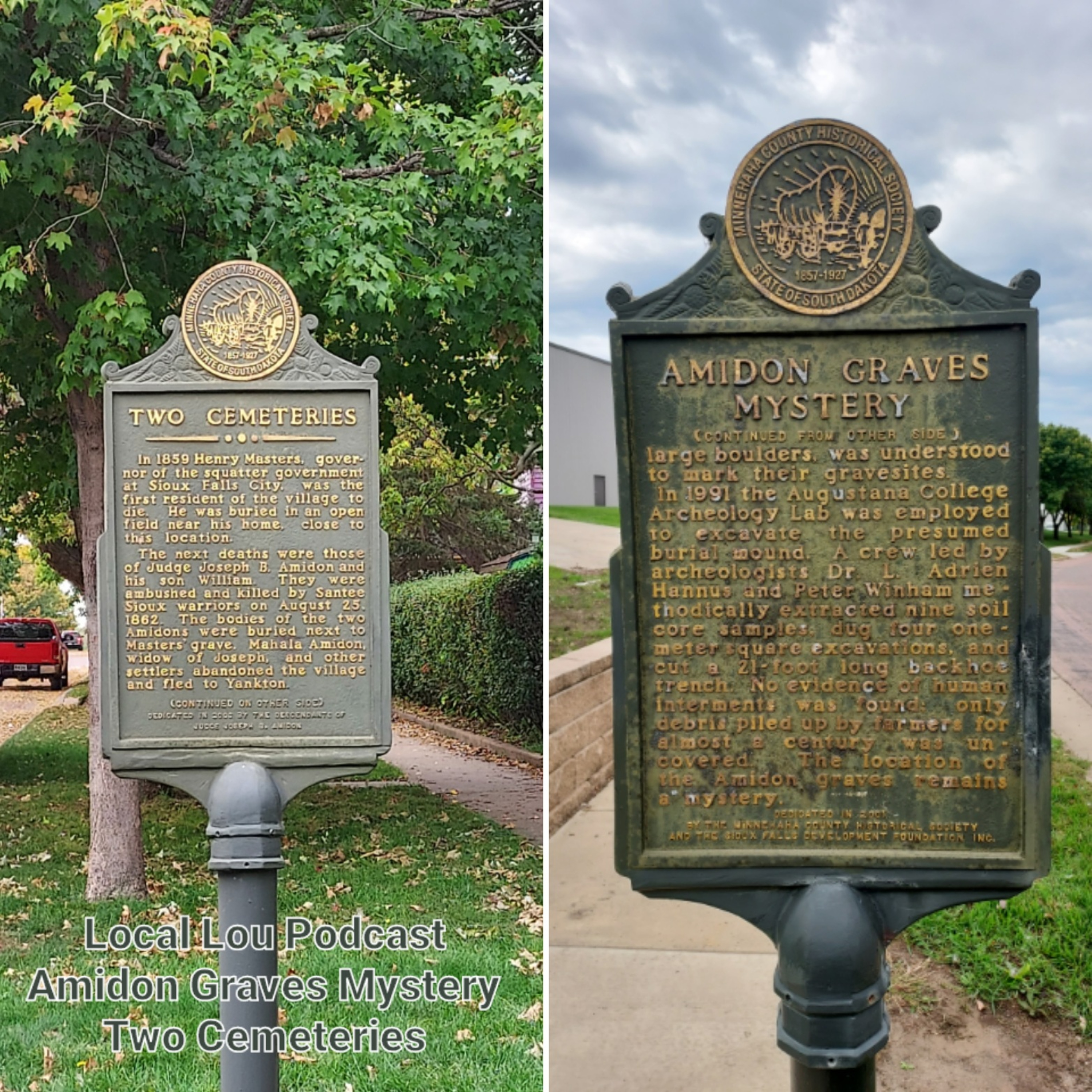 Through previous historical markers we have learned about Judge Joseph B Amidon and his son William who were pioneering homesteaders in the budding Sioux Falls City and were killed by Native American warriors in 1862. We know Sioux Falls was soon evacuated, but first, they buried the bodies, so how are the bodies now missing? Lets read a few historical markers and piece together what we can, but I will let you know right now... The Amidon's are missing.