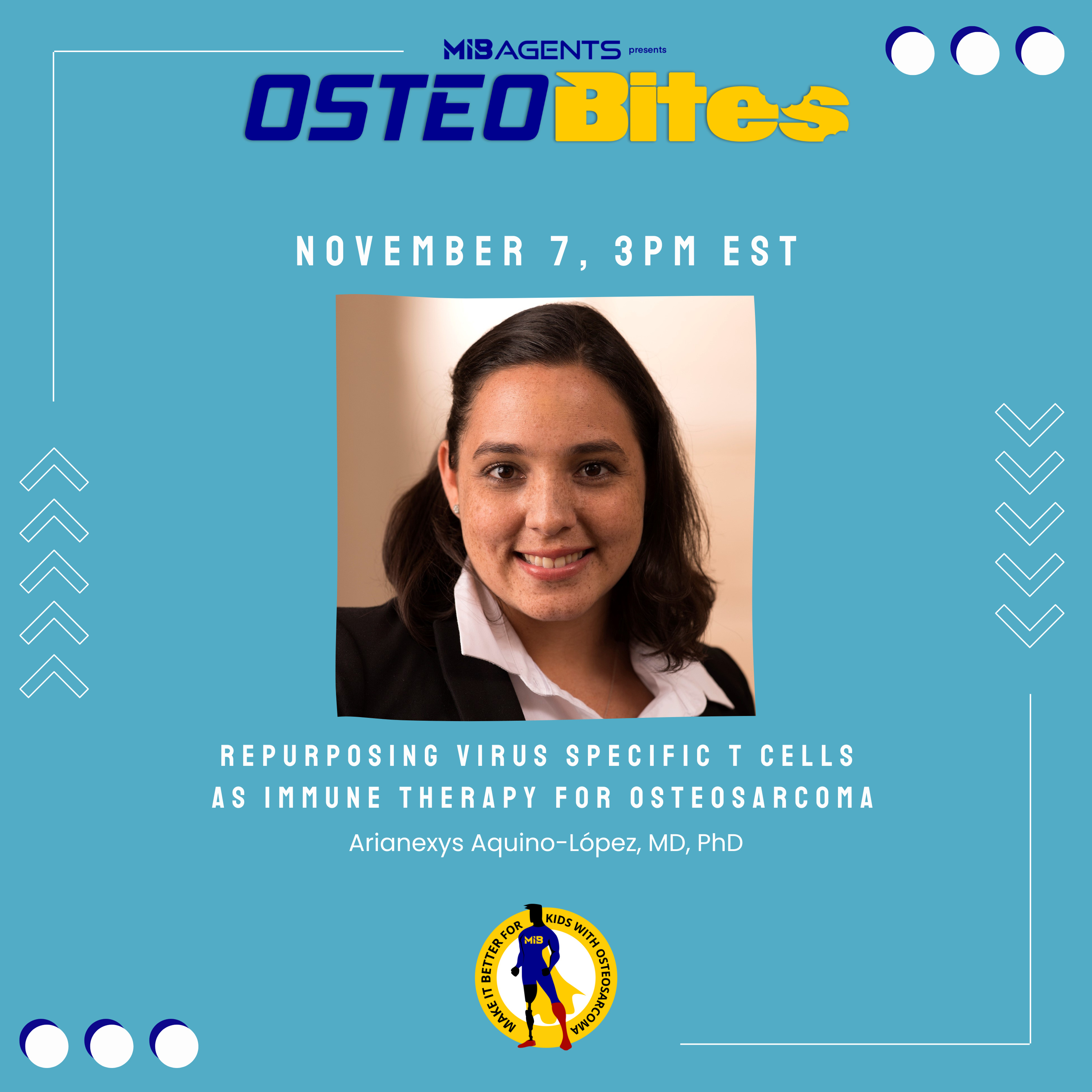 One of our MIB Agents OutSmarting Osteosarcoma Young Investigator 2024 grant recipients, Arianexys Aquino-López, MD, PhD, a physician-scientist from Texas Children's Hospital/Baylor College of Medicine will provide an overview of her funded work on Repurposing Virus Specific T cells as Immune Therapy for Osteosarcoma. In this presentation, she discusses repurposing virus-specific T cells so that they become an immune therapy for osteosarcoma. She will also describe how oncolytic virotherapy promotes immune stimulation at the tumor site increasing the anti-tumor activity of virus-specific T cells.Dr. Arianexys Aquino-López is an Instructor at the Department of Pediatrics, Section of Hematology-Oncology, Baylor College of Medicine. Dr. Aquino-Lopez is committed to a career as a pediatrician-scientist with a particular interest in improving treatment options for children with cancer through the design of novel immune therapies, including cell therapies and antibody therapies. She is also interested in studying the impact of tumor microenvironment in immune suppression to develop approaches to overcome cancer immune evasion. Witnessing her brother go through pediatric cancer treatment served as an inspiration for her to study ways to improve cancer therapies.