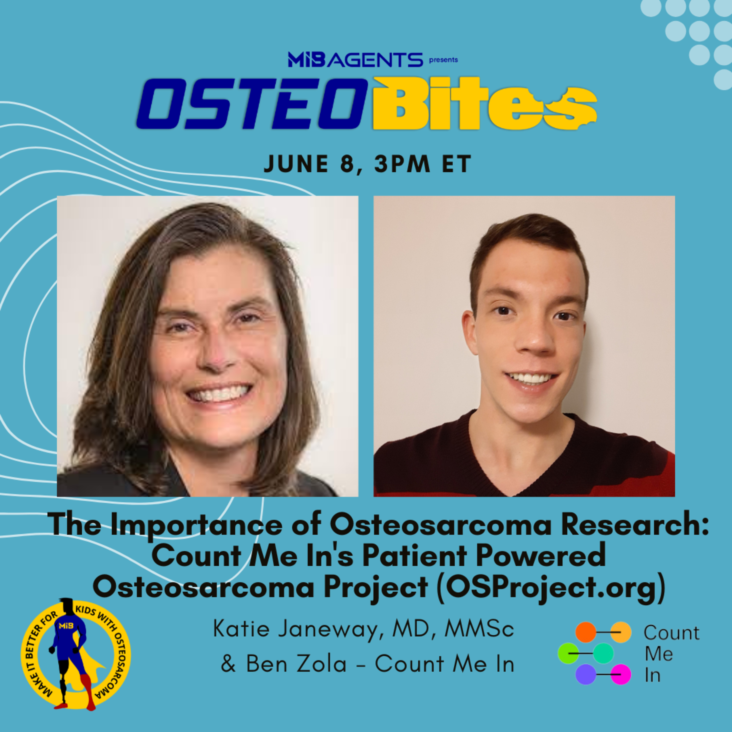 Dr. Katie Janeway, a pediatric hematologist-oncologist of Dana Farber/Boston's Children Hospital, and Benjamin Zola, a Project Manager at Count Me In (CMI), will be joining to share more insight into Count Me In's patient- powered Osteosarcoma research project, and the potential outcomes for discoveries that can have a direct impact on the future osteosarcoma.