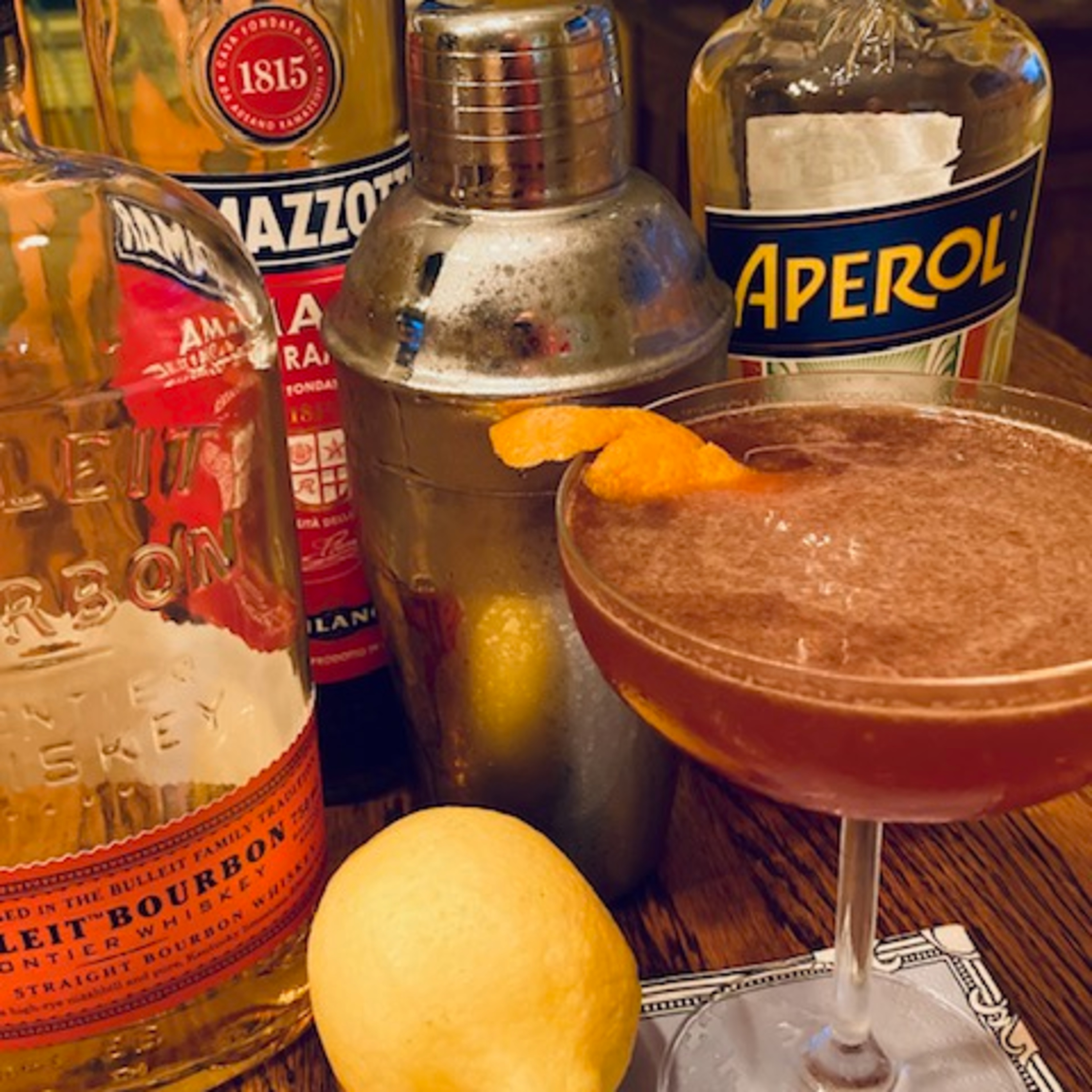 Equal parts bourbon, amaro (usually Nonino or Ramazotti), aperol and lemon juice.
