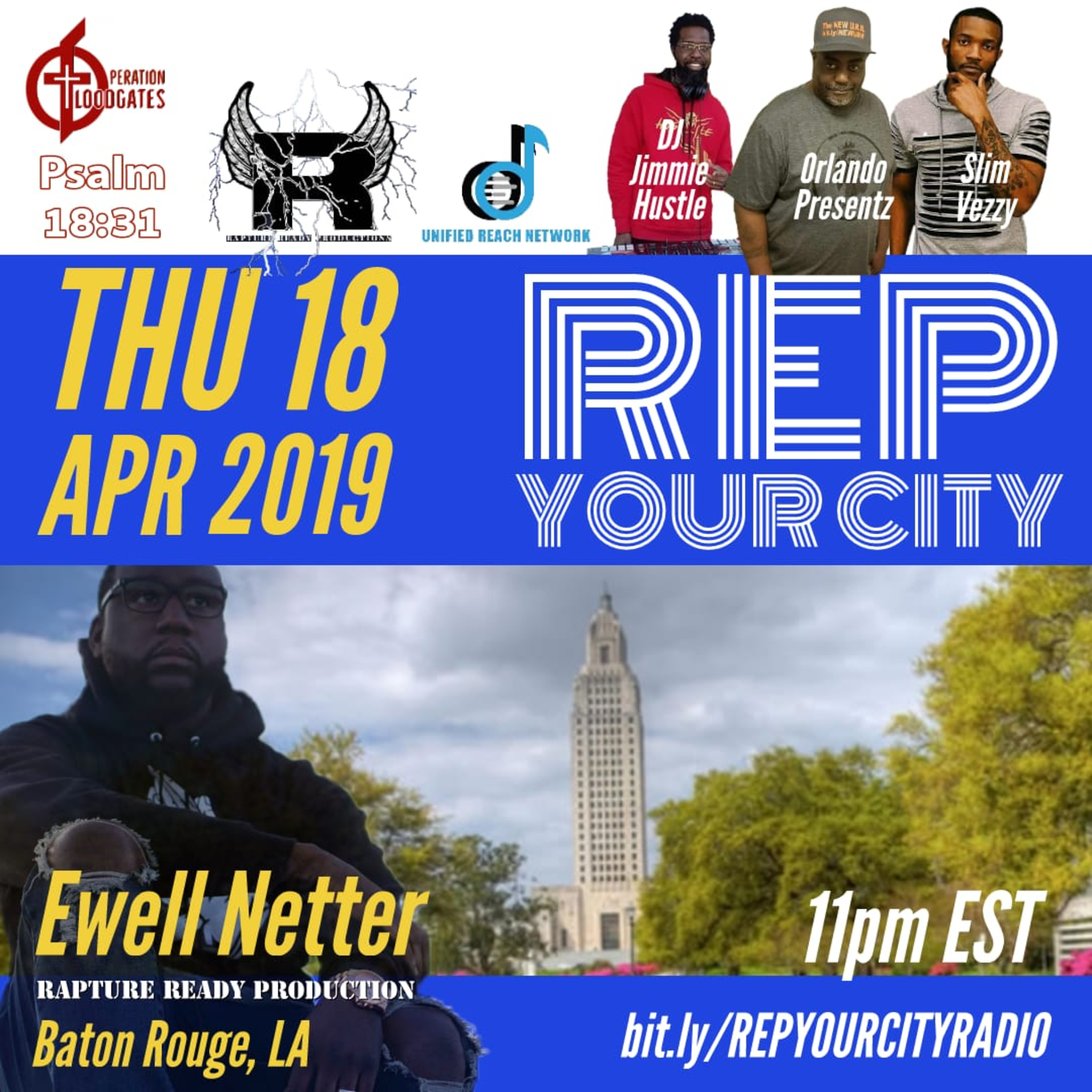 WELCOME TO REP YOUR CITY WE SAT DOWN WITH EWELL NETTER OF RAPTURE READY PRODUCTIONS, PLUS WE HAD BROTHER SLIM VEZZY AND DJ JIMMIE HUSTLE MINI MIX, I PRAY YOU ENJOY AND SHARE WITH YOUR FRIENDS AND FAMILY.