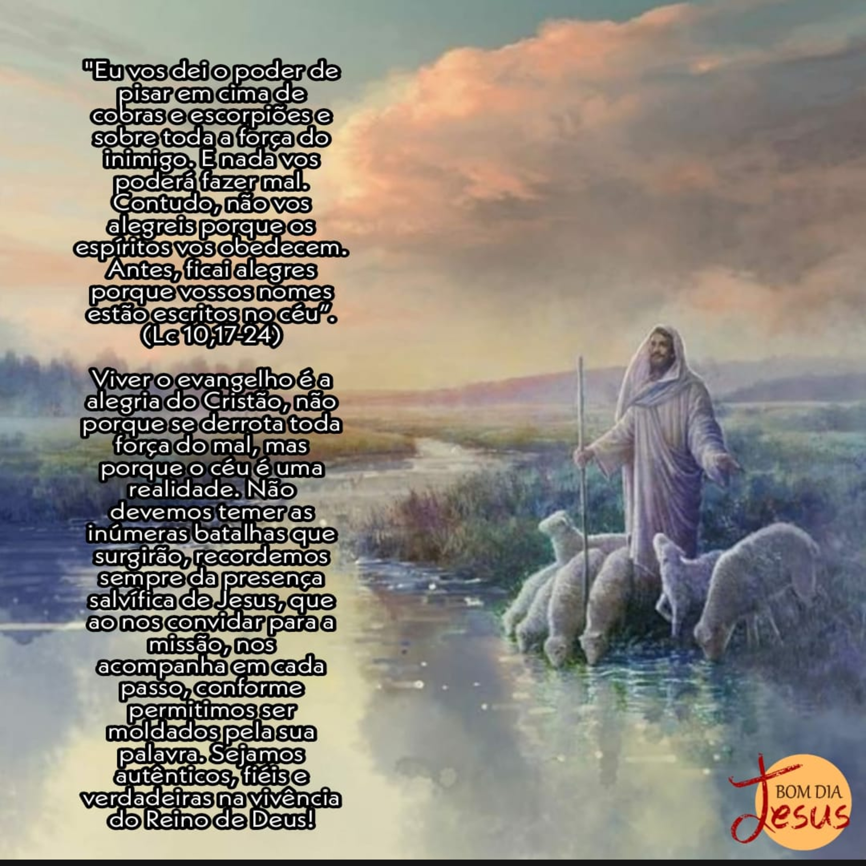 03/10/2020 - "Eu vos dei o poder de pisar em cima de cobras e escorpiões e sobre toda a força do inimigo. E nada vos poderá fazer mal. Contudo, não vos alegreis porque os espíritos vos obedecem. Antes, ficai alegres porque vossos nomes estão escritos no céu”. (Lc 10,17-24). Viver o evangelho é a alegria do Cristão, não porque se derrota toda força do mal, mas porque o céu é uma realidade. Não devemos temer as inúmeras batalhas que surgirão, recordemos sempre da presença salvífica de Jesus, que ao nos convidar para a missão, nos acompanha em cada passo, conforme permitimos ser moldados pela sua palavra. Sejamos autênticos, fiéis e verdadeiras na vivência do Reino de Deus! Deus abençoe. Por Eduardo Alascio. PROPOSTA DO DIA: Facilmente nos deixamos seduzir pelas coisas do mundo. Hoje experiente se deixar moldar e guiar pela palavra de Deus. É a vida batendo a tua porta!