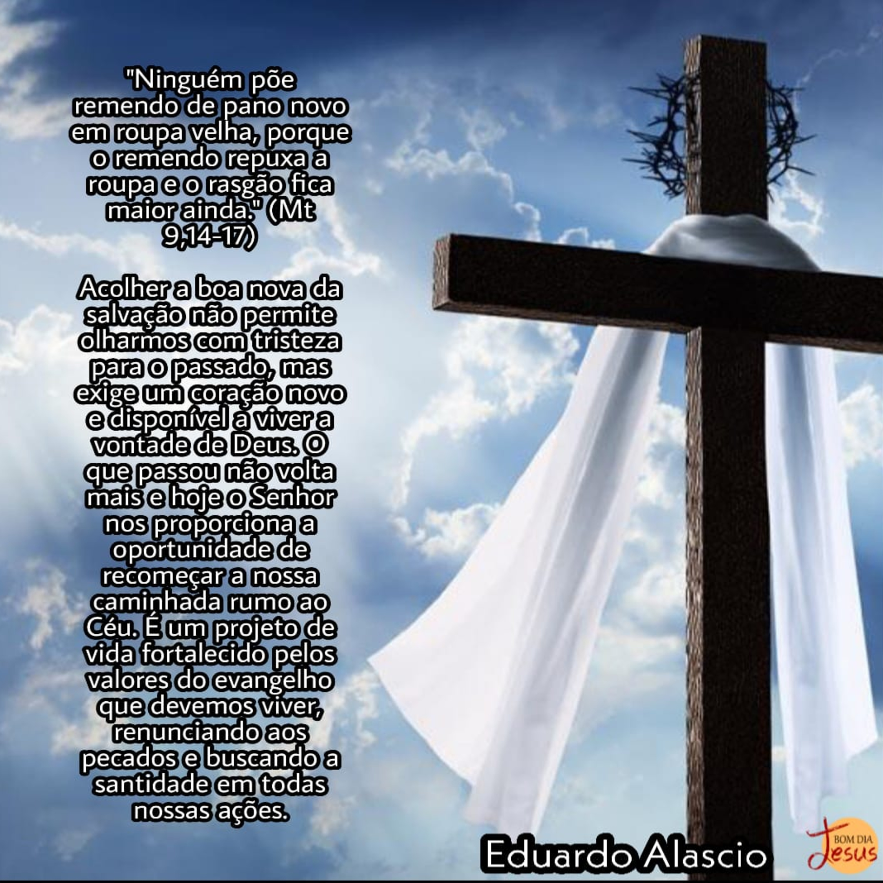 04/07/2020 - "Ninguém põe remendo de pano novo em roupa velha, porque o remendo repuxa a roupa e o rasgão fica maior ainda." (Mt 9,14-17). Acolher a boa nova da salvação não permite olharmos com tristeza para o passado, mas exige um coração novo e disponível a viver a vontade de Deus. O que passou não volta mais e hoje o Senhor nos proporciona a oportunidade de recomeçar a nossa caminhada rumo ao Céu. É um projeto de vida fortalecido pelos valores do evangelho que devemos viver, renunciando aos pecados e buscando a santidade em todas nossas ações. Deus abençoe. Por Eduardo Alascio. PROPOSTA DO DIA: viver a boa nova é romper com velhos hábitos que nos impediam de viver a vontade de Deus. O que ainda preciso renunciar para viver a plenitude da vida?
