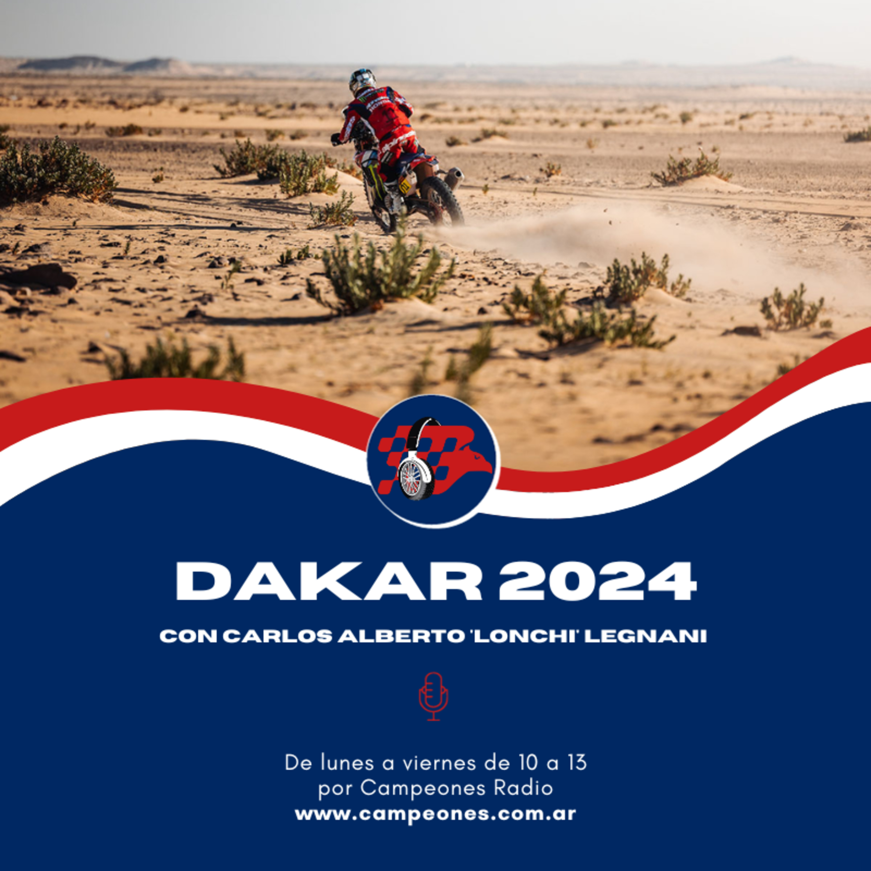 Campeones Radio presenta: Dakar 2024! La más completa y extensa cobertura de la competencia más dificil y peligrosa del mundo, con enviados especiales desde Arabia Saudita. Todos los días de la semana en vivo .la conducción de Carlos Alberto Legnani y Lonchi Legnani. De Lunes a Viernes de 10 a 13 y de 22 a 23, en dúplex con Radio Continental AM 590, los Sábados de 17 a 18 y los Domingos, la maratónica edición especial de 8 a 15. Campeones es Dakar... ¡Dakar es Campeones!