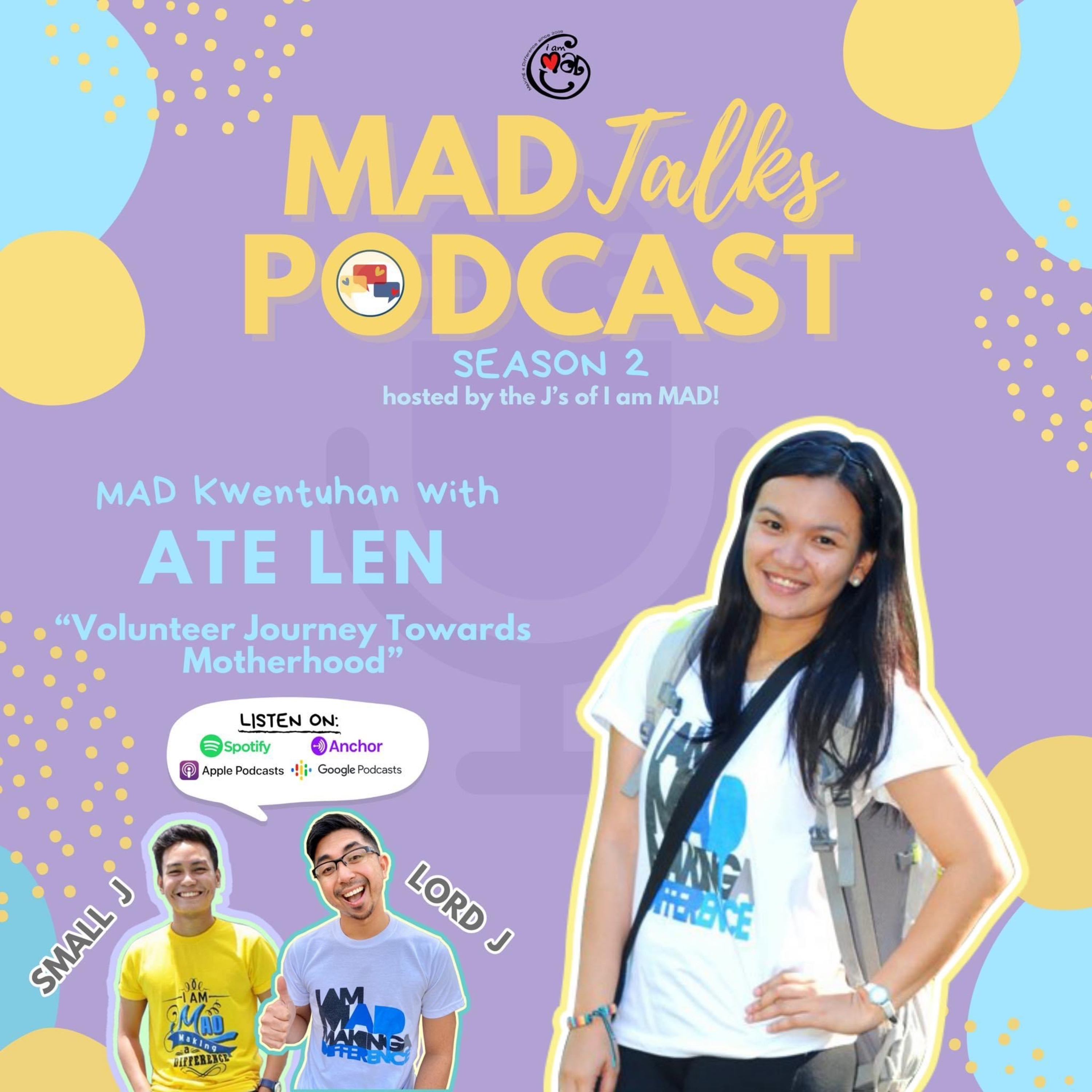 Volunteering and Motherhood. Do these two concepts have some things in common? Well, it turns out there's a lot. This episode of MAD Talks podcast revisits Ate Len's experience in joining I am MAD and how it eventually prepared and influenced her approach towards being a mother. Small J and Lord Jay have had the privilege of joining our guest in reminiscing and processing the joys and tears (yes, there were tears!) brought about by MAD camps and the overall volunteer experience.