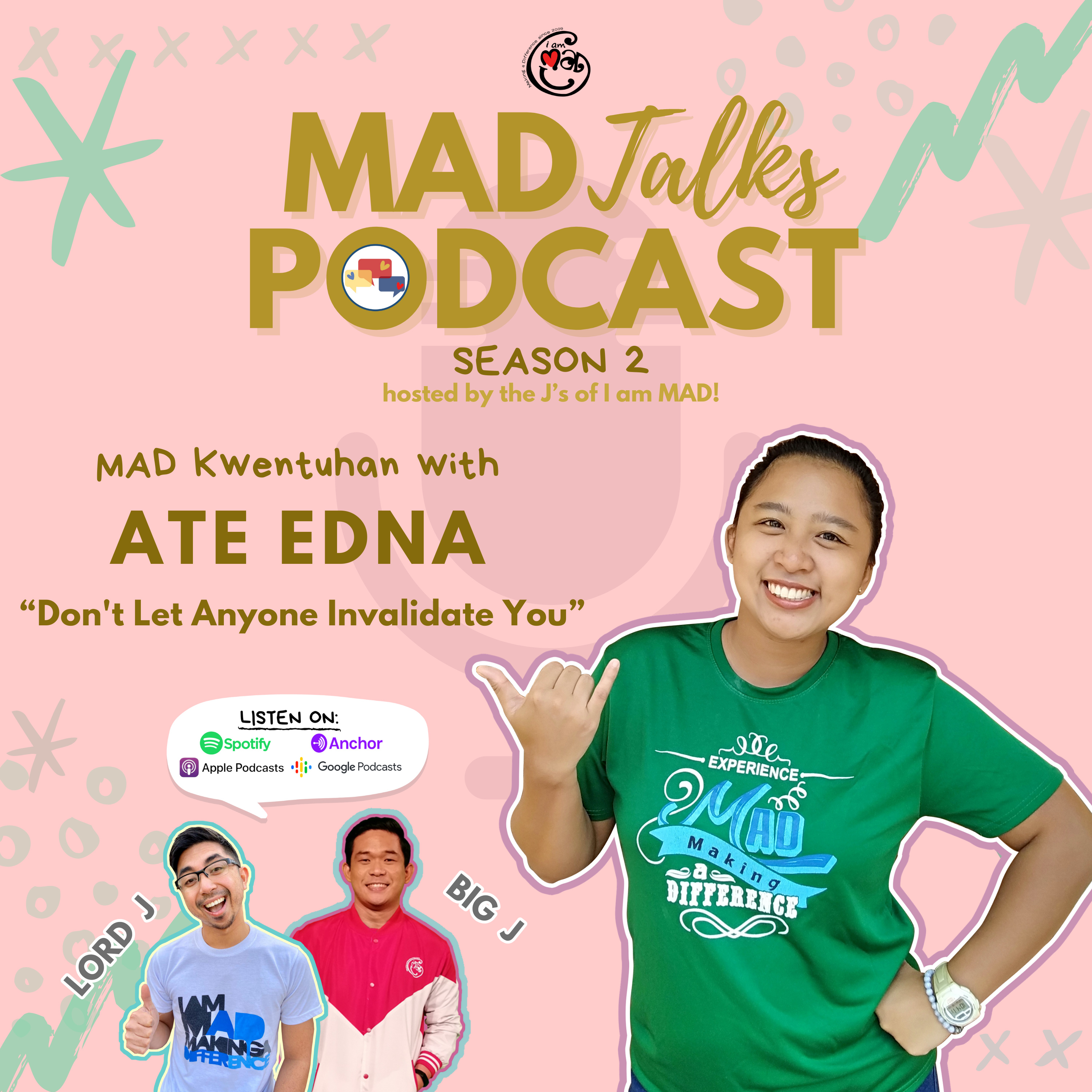 Never ever let anyone invalidate you! This is the central message of this MAD Talks Podcast episode for you. This time, Big Jay and Lord Jay had a heart-to-heart conversation with Ate Edz, another MAD volunteer from Davao and one of our Instagram account's managers. Discover how I am MAD gave her a sense a purpose especially during this time that the world is battling with a global pandemic. Also, listen out for Ate Edz' advice to people subjected to invalidating situations on the gimmick segment that made her a VALIDictorian VALIDator! :)