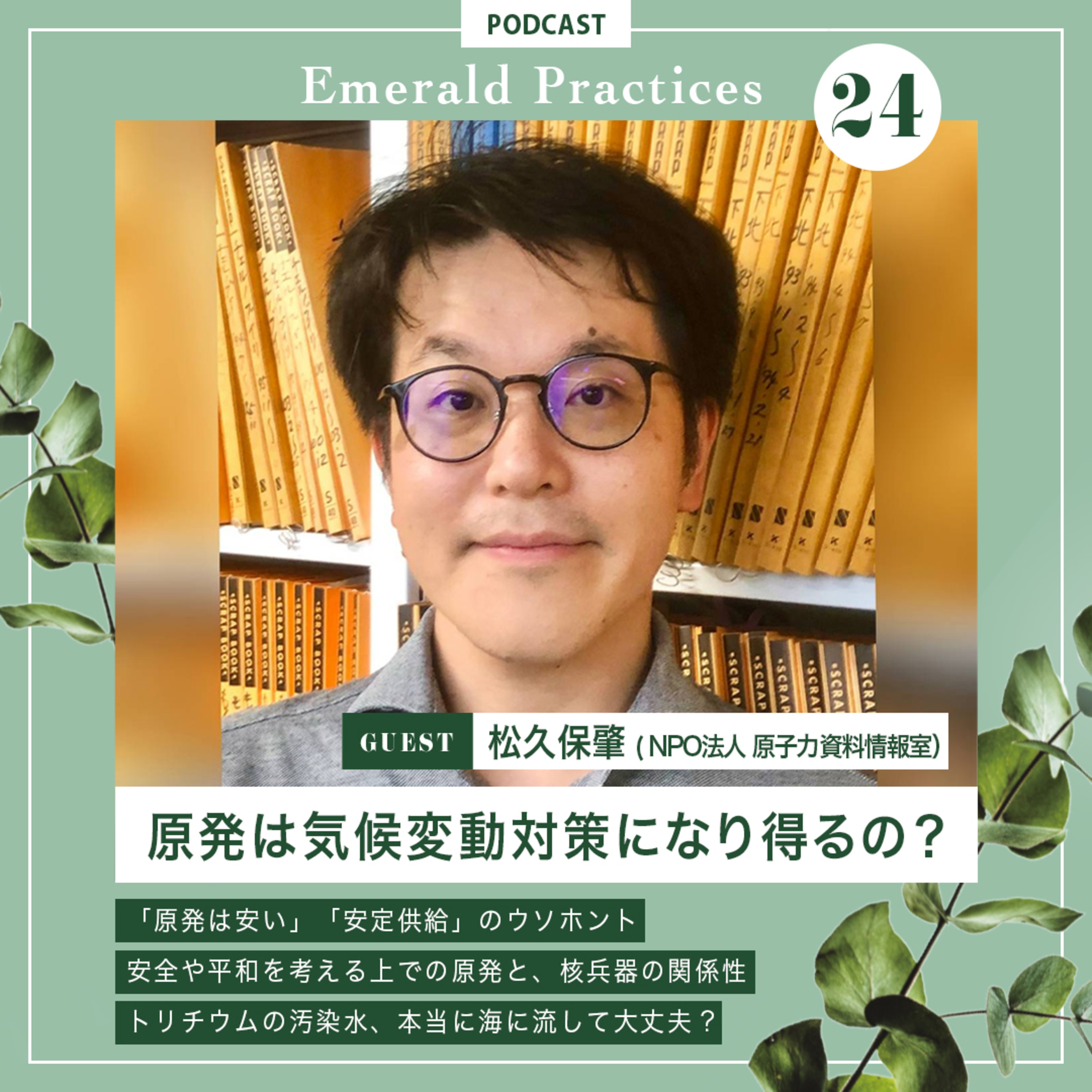 福島の原発事故から10年たった現在、気候変動対策のひとつとして挙げられがちな原発は、本当に必要なエネルギー源なのか?原発の是非や、推進派/反対派双方の主張について、原子力資料情報室の事務局長にずばり聞く。ゲスト:松久保 肇(NPO法人 原子力資料情報室 事務局長)*原発は安い!のウソ、ホント*脱原発への道のり、安全な廃炉方法*原発と核兵器の関係性*汚染水、トリチウムは本当に安全なの?*原発はそもそも安定供給って本当?■松久保 肇 1979年、兵庫県生まれ。2003年国際基督教大学卒、2016年法政大学大学院公共政策研究科修士課程修了。金融機関勤務をへて2012年7月よりCNICスタッフ。国際問題を担当。共著に「検証 福島第一原発事故」(七つ森書館)、「原発災害・避難年表」(すいれん舎)など。■TAO 俳優 1985年千葉県生まれ。カリフォルニア在住。14歳でファッションモデルを始め、2006年のパリコレクションより国内外に活動の場を広げる。2013年公開「ウルヴァリン:SAMURAI」でスクリーンデビュー。俳優業の傍ら、気候危機やアニマルライツの認識を高めるため2020年よりソーシャルメディアプラットフォームでEmerald Practices-エメラルド プラクティシズをローンチ。同年5月からポッドキャストの配信を始める。 Instagram: @taookamoto番組SNS Instagram:@emeraldpractices Twitter:@emeraldpractice