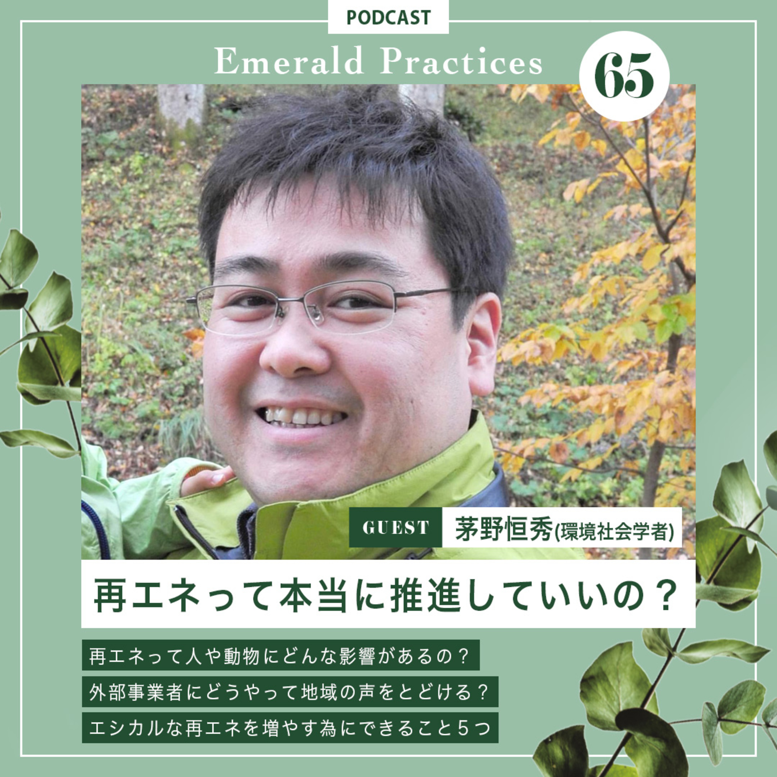 気候変動を食い止めるために、再生可能エネルギーへの転換は必要不可欠。しかし、再エネの導入には地域の声や生態系への配慮も必要。今回のエピソードでは、再エネ導入の公正さや地域への影響を考えるためのヒントを、茅野恒秀さんから学びます。ゲスト:茅野恒秀(環境社会学者)*再エネって、人や動物にどんな影響があるの?*再エネは、環境保護だけじゃなくて、どんな可能性を秘めているの?*地域の力で再エネを発展させよう!「コミュニティ・パワー」とは?*土地の管理は再エネの成功の鍵!*外部事業者にどうやって地域の声を届ける?*エシカルな再エネを増やすためにできること5つ■茅野恒秀 信州大学 人文学部准教授・同グリーン社会協創機構地域カーボンニュートラル推進部門長。1978年東京生まれ。博士(政策科学)。専門は環境社会学、環境・地域エネルギー政策。法政大学と同大学院で環境社会学を学び、群馬県みなかみ町や青森県六ヶ所村などを現場に森林資源管理やエネルギー政策と地域社会の関係を研究してきた。郷土史から政策までを幅広く扱うフィールドワーカー。日本自然保護協会勤務、岩手県立大学准教授を経て2014年より信州大学人文学部准教授。2022年からは同グリーン社会協創機構地域カーボンニュートラル推進部門長を兼務。長野県環境審議会の専門委員として長野県ゼロカーボン戦略の策定と「地域と調和した太陽光発電事業の推進に関する条例」の制定に関わる。松本市、上田市、伊那市、箕輪町、高森町、飯島町、宮田村、秋田県鹿角市などで地球温暖化対策実行計画の策定を支援。現在は環境社会学会理事(編集委員長)、日本自然保護協会評議員、長野県「くらしふと信州」運営ミーティング座長、安曇野市里山再生計画推進協議会会長、伊那市新産業技術推進協議会サステイナブル環境部会長、松本平ゼロカーボン・コンソーシアム運営委員長などを務める。■小野 りりあん|気候活動家/モデル 89年八戸生まれ札幌育ち。Spiral Club、Green TEA ~Team Environmental Activistsを共同設立。COP25マドリードへ飛行機に乗らずして目指す旅の実践から、Instagramにて気候変動情報&アクションを発信。気候危機対策を求める[平和的ハンガーストライキを含むアクション]を2021年4月に友人eriと実践。Instagram: @_lillianono_ @green.tea.official