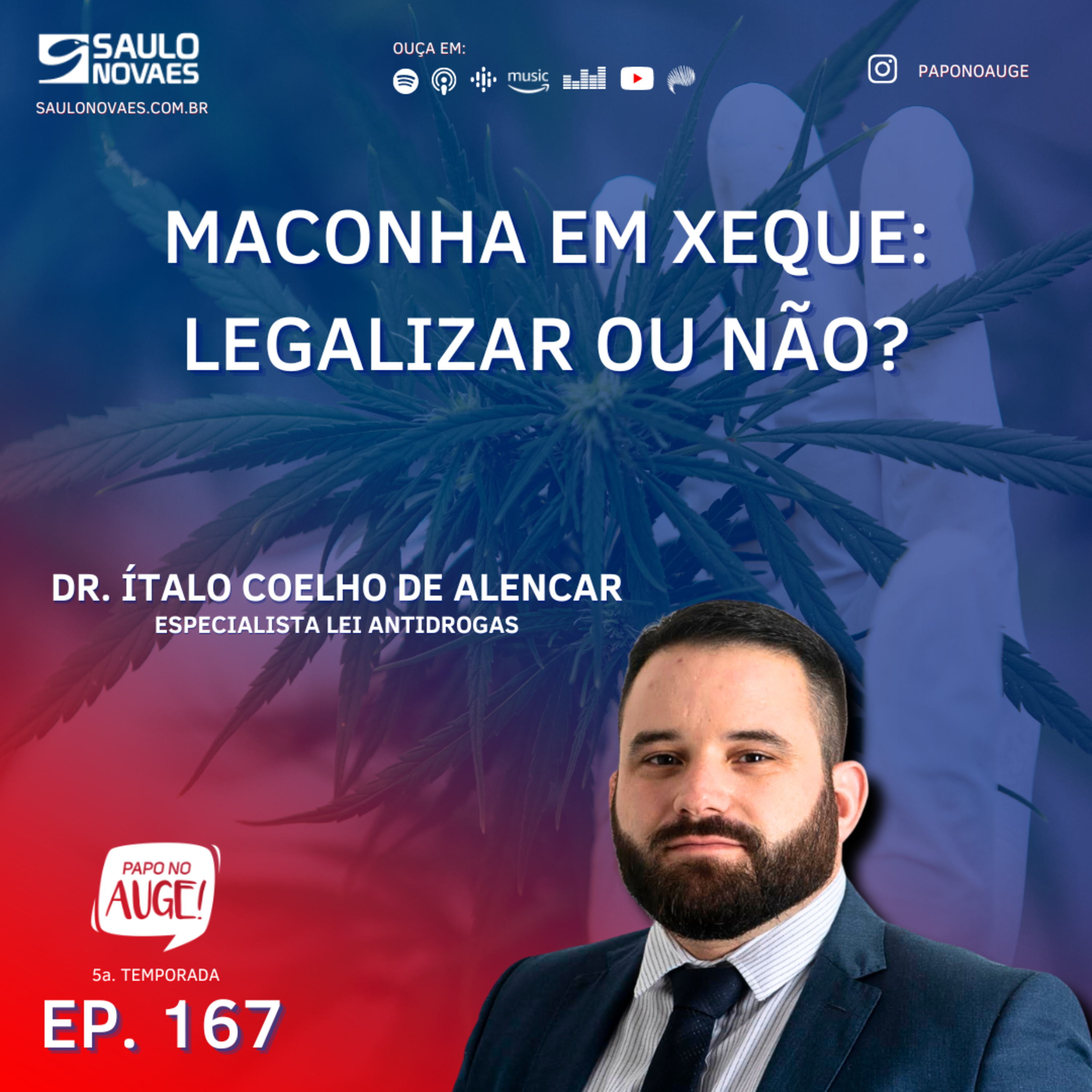 O episódio 172 do podcast Papo no Auge! discute noções legais sobre a legalização da Cannabis com o advogado Ítalo Coelho de Alencar, especialista em direito e processo penal, assessor jurídico de pacientes, associações e empresas de Cannabis medicinal e pesquisador em políticas sobre drogas, com publicação em livros e revistas científicas.