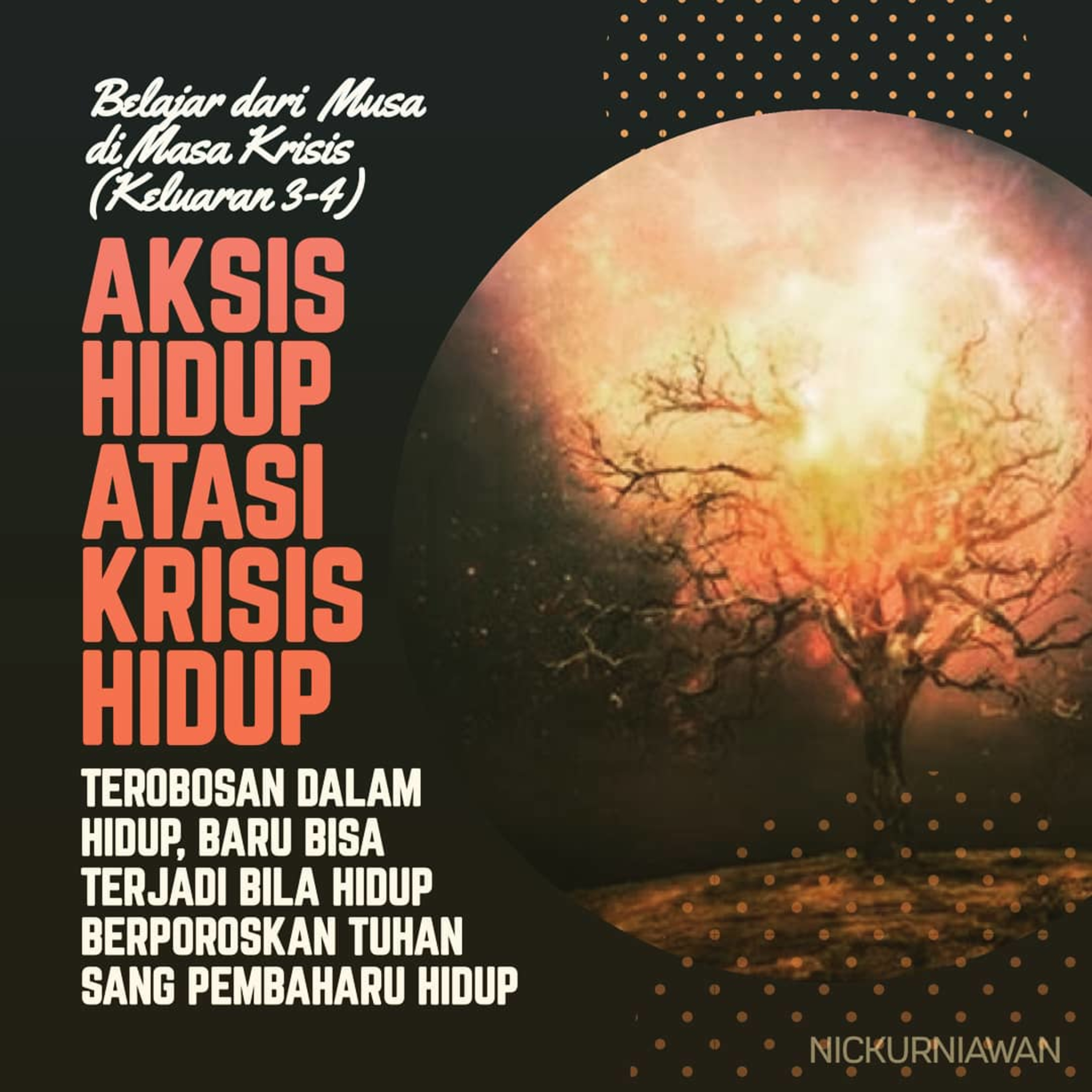Musa mengalami masa krisis terbesar dalam hidupnya di padang gurun pada usia 40-80 tahun, ia mengalami 3 KRISIS BESAR dalam hidupnya: (1) KRISIS ATENSI DAN IDENTITAS (Keluaran 3:11-12) di mana ia mengalami kesepian dan kesendirian di padang gurun yang menyebabkan ia kehilangan identitas kebangsaannya yang 'blend' antara natur sebagai orang Yahudi yang dididik dengan budaya Mesir, (2) KRISIS EKSISTENSI DAN SPIRITUALITAS (Keluaran 3:13-14) di mana ia memertanyakan keberadaan Allah nya dan mengalami kekeringan spiritual yang penuh keraguan akan keberadaan Allah saat keadaan dirinya terpuruk, dan (3) KRISIS POTENSI DAN KONTINUITAS (Keluaran 4:1-11) di mana ia meragukan potensi dirinya dan kemampuannya memimpin Israel secara berkelanjutan. TUHAN ALLAH memanggil Musa lewat penglihatan semak berapi yang menyala untuk mengajak Musa hidup berAKSISkan Tuhan dalam mengatasi KRISIS hidupnya.