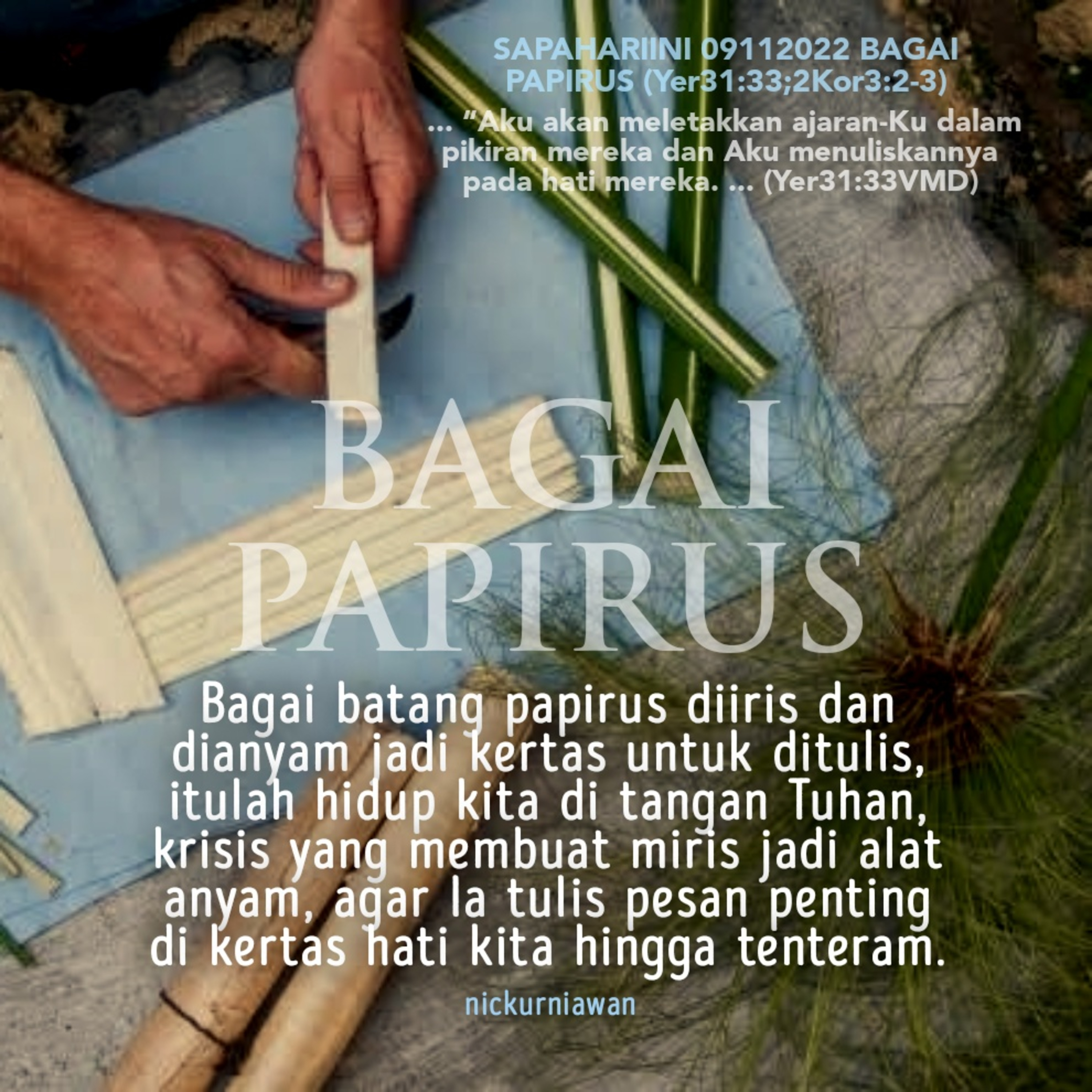 Sabda Tuhan mengingatkan bahwa bagaikan batang papirus diiris dan dianyam jadi kertas untuk ditulis, itulah hidup kita di tangan Tuhan, krisis yang membuat miris jadi alat anyam, agar Ia tulis pesan penting di kertas hati kita hingga tenteram.