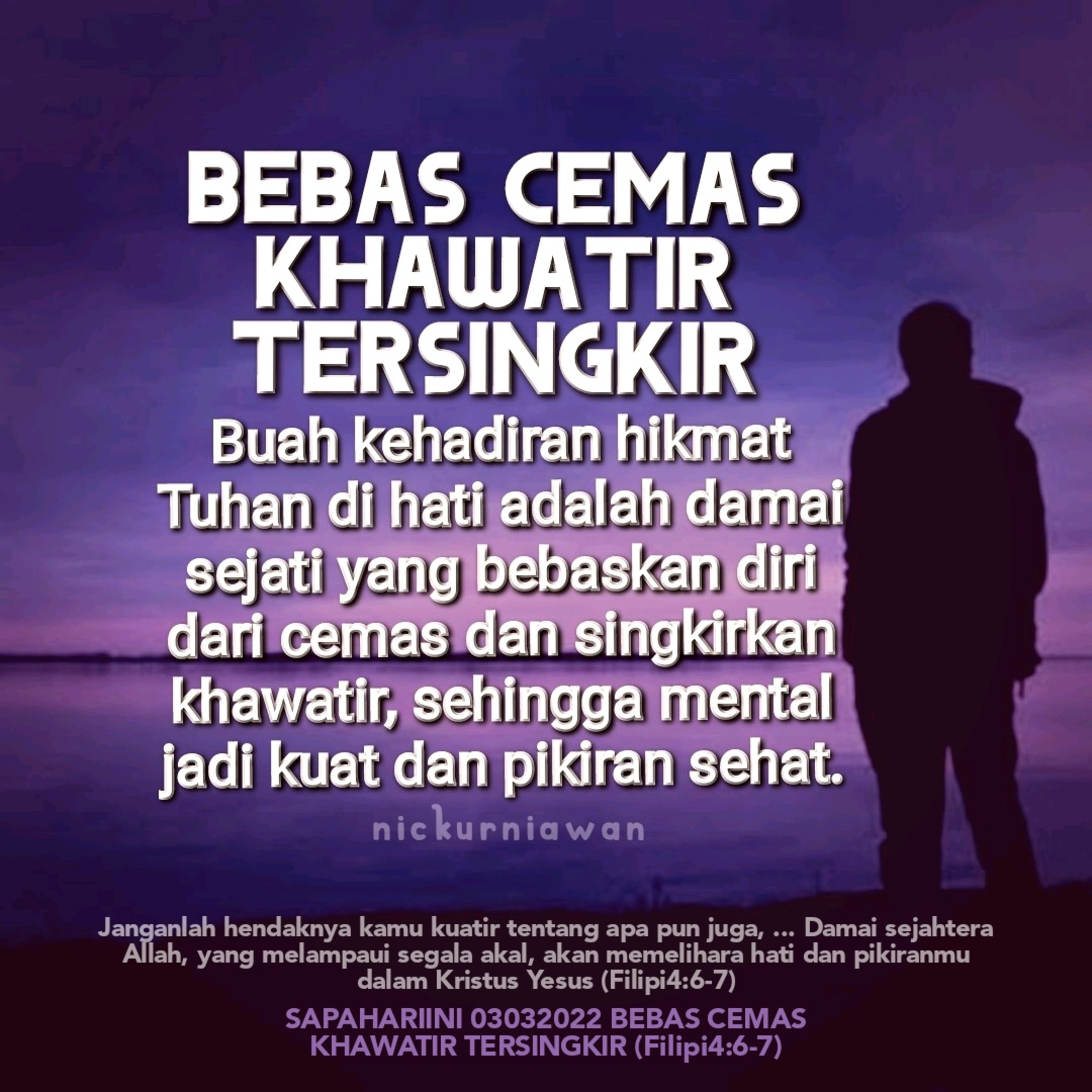 Sabda Tuhan mengajarkan bahwa buah dari kehadiran Tuhan dan hikmatNya di hati adalah damai sejati yang bebaskan diri dari cemas dan singkirkan khawatir, sehingga mental jadi kuat dan pikiran sehat.