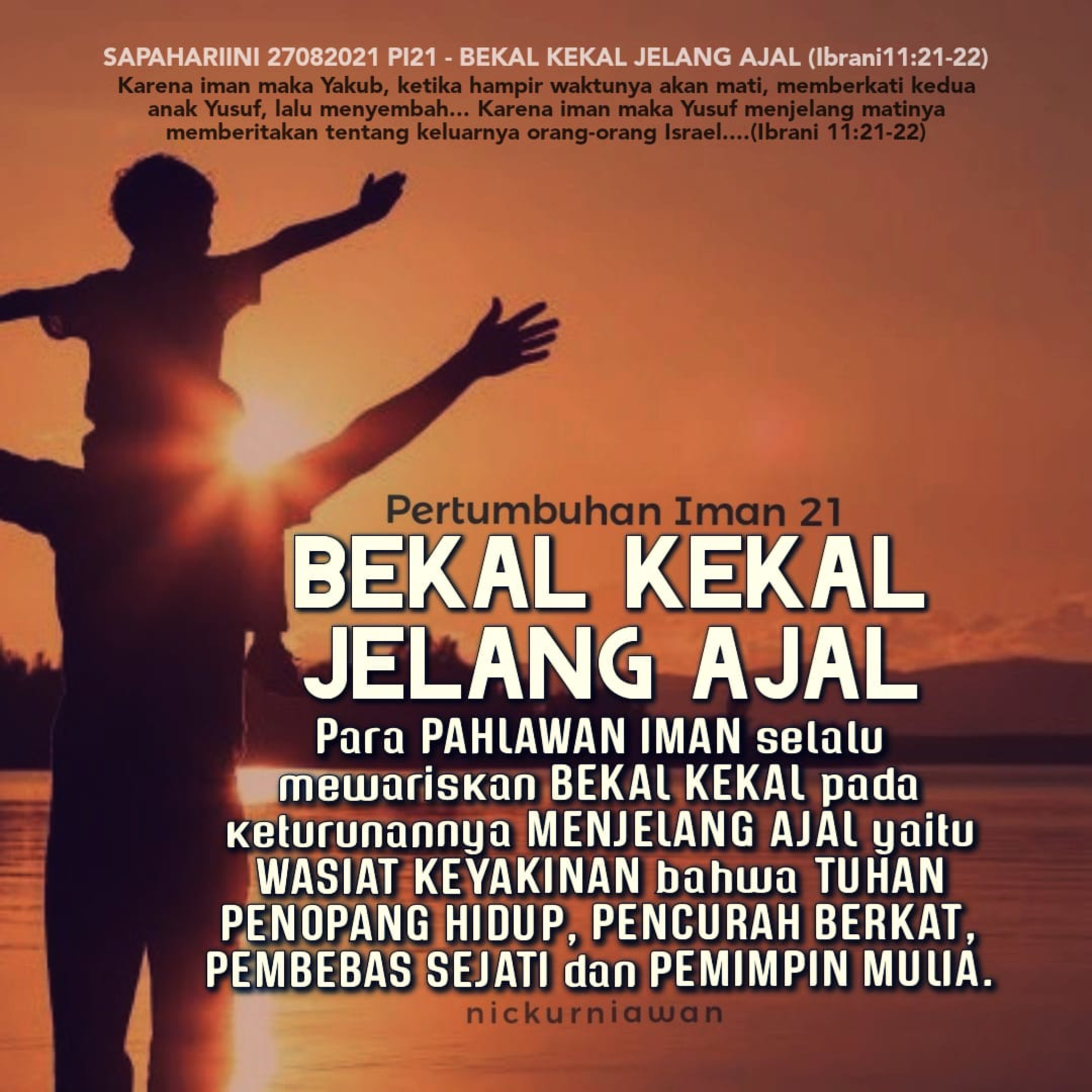 Sabda Tuhan menyapa tentang Para Pahlawan Iman yang selalu mewariskan BEKAL KEKAL pada keturunannya MENJELANG AJAL mereka, berupa WASIAT KEYAKINAN bahwa TUHAN PENOPANG HIDUP, PENCURAH BERKAT, PEMBEBAS SEJATI dan PEMIMPIN MULIA.