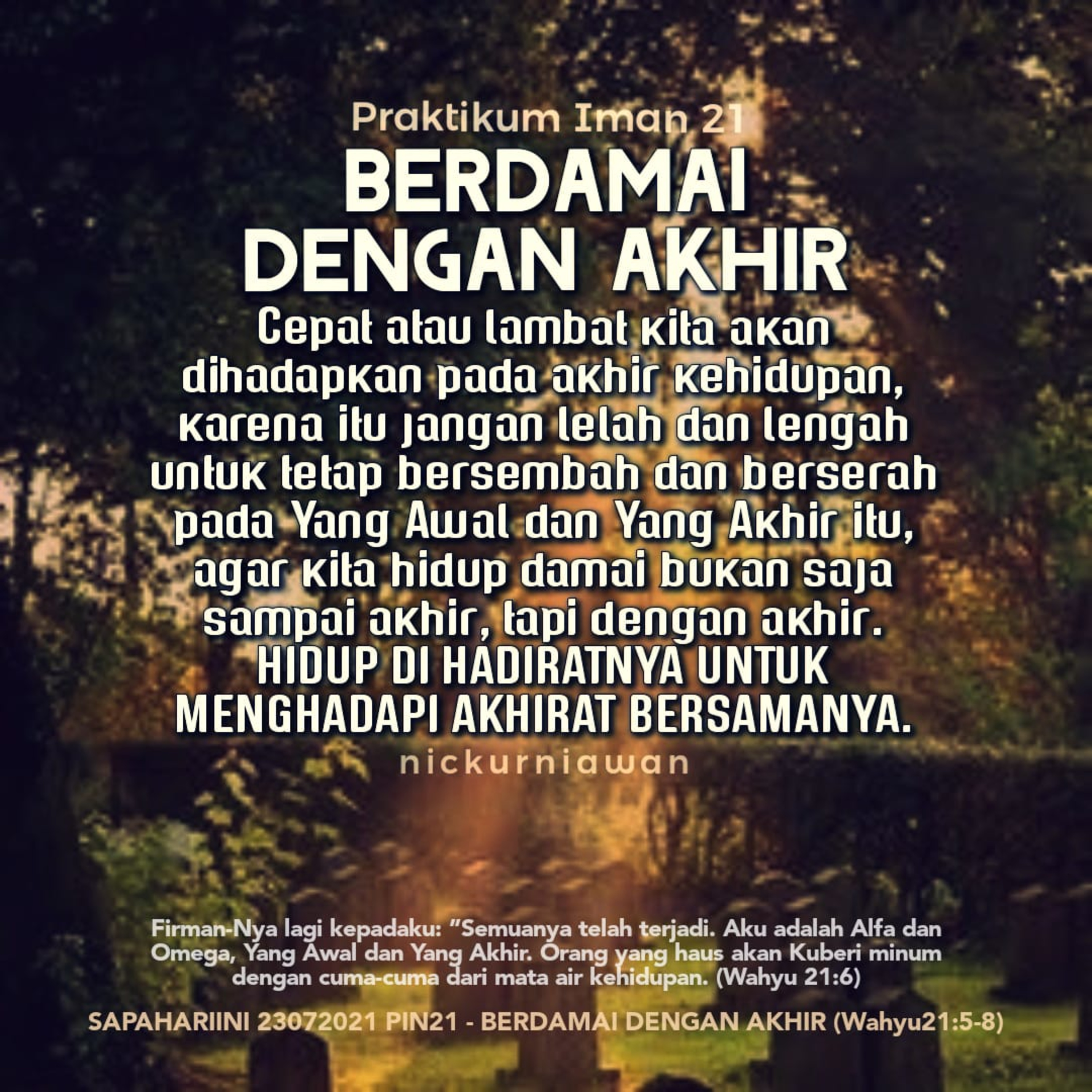 Sabda Tuhan dari kitab terakhir tentang hal-hal terakhir dari kehidupan dunia ini, ingin menegaskan tentang praktik iman di dalam menghadapi sebuah akhir, yaitu cepat atau lambat kita akan dihadapkan pada akhir kehidupan, karena itu jangan lelah dan lengah untuk tetap bersembah dan berserah pada Yang Awal dan Yang Akhir itu, agar kita hidup damai bukan saja sampai akhir, tapi dengan akhir. HIDUP DI HADIRATNYA UNTUK MENGHADAPI AKHIRAT BERSAMANYA.