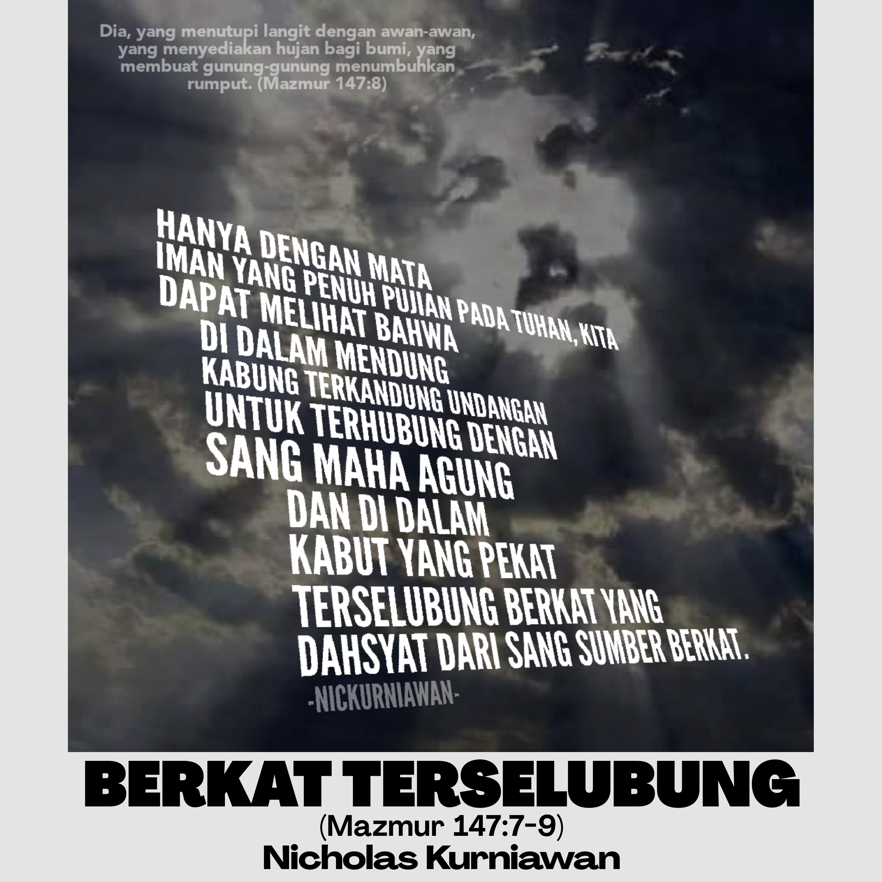 BERKAT TERSELUBUNG (Mazmur 147:7-9): Sabda Tuhan lewat Mazmur Pujian ini menjelaskan bahwa hanya dengan mata iman yang penuh pujian pada Tuhan, kita dapat melihat bahwa di dalam mendung kabung terkandung undangan untuk terhubung dengan Sang Maha Agung dan di dalam kabut yang pekat terselubung berkat yang dahsyat dari Sang Sumber Berkat. MATA IMAN PENUH PUJIAN PADA TUHAN MEMPERTAJAM PANDANGAN DALAM MENJALANI KEHIDUPAN.