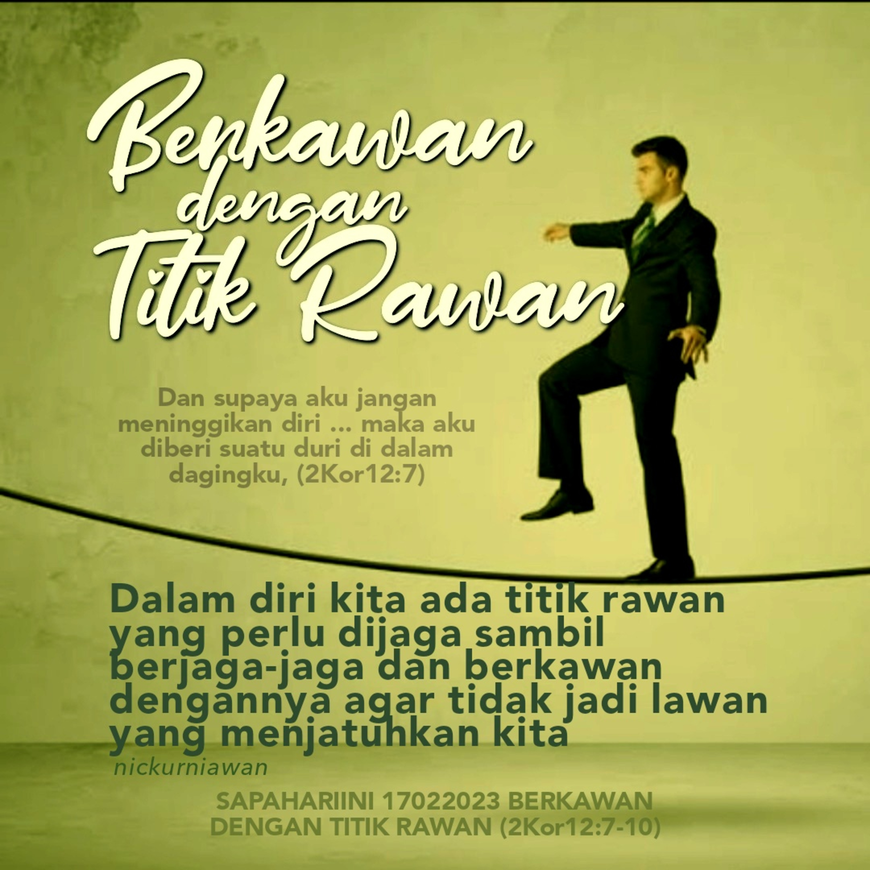 Sabda Tuhan mengingatkan kita bahwa dalam diri kita ada titik rawan yang perlu dijaga sambil berjaga-jaga dan berkawan dengannya agar tidak jadi lawan yang menjatuhkan kita, dan untuk itu kita perlu selalu berkawan dengan Tuhan, Sang Maha Kawan.