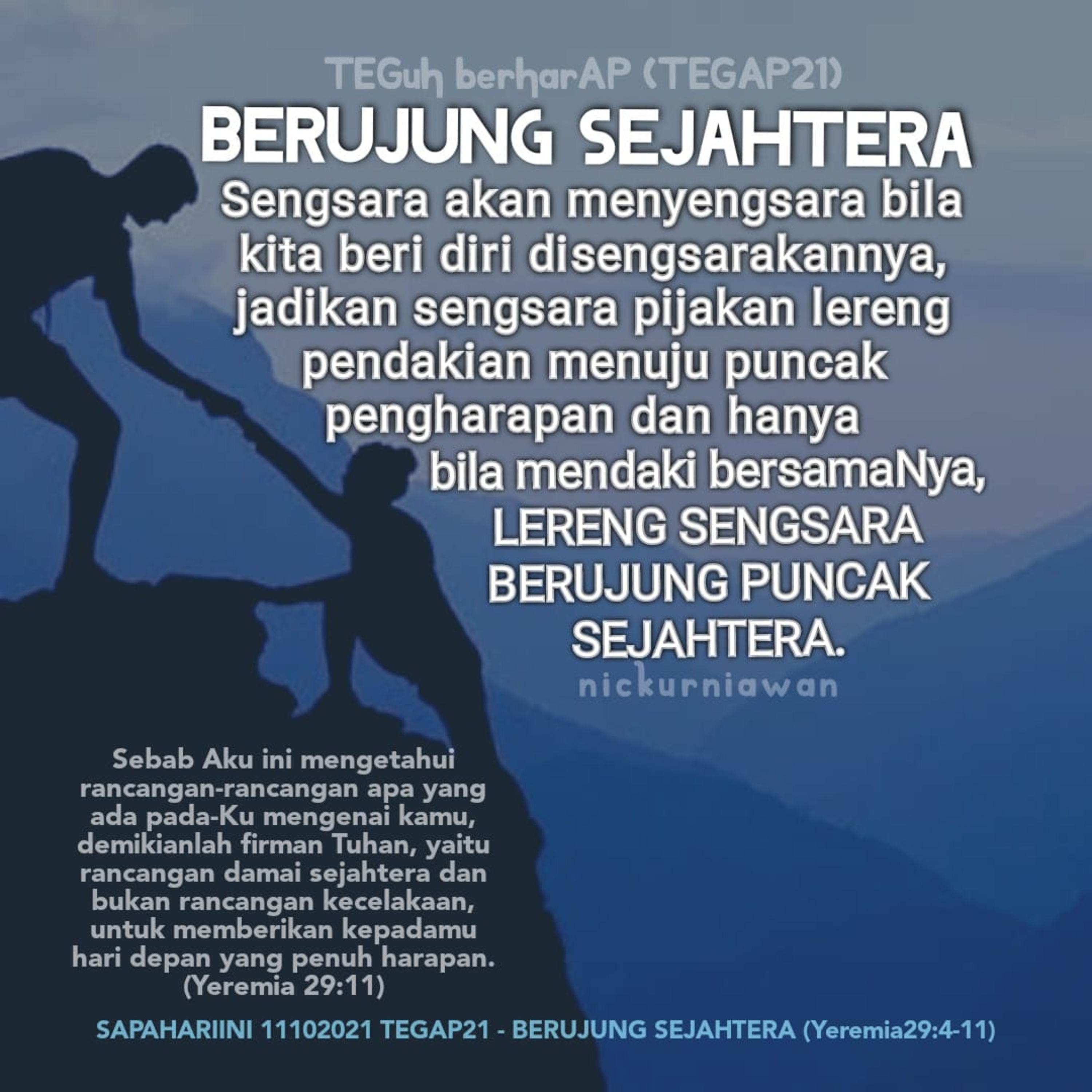 Sabda Tuhan mengajarkan bahwa sengsara akan menyengsara bila kita beri diri sendiri disengsarakan, karena itu jadikanlah sengsara bagai pijakan lereng pendakian menuju puncak pengharapan. Hanya bila mendaki bersamaNya, LERENG SENGSARA SELALU BERUJUNG PUNCAK SEJAHTERA.