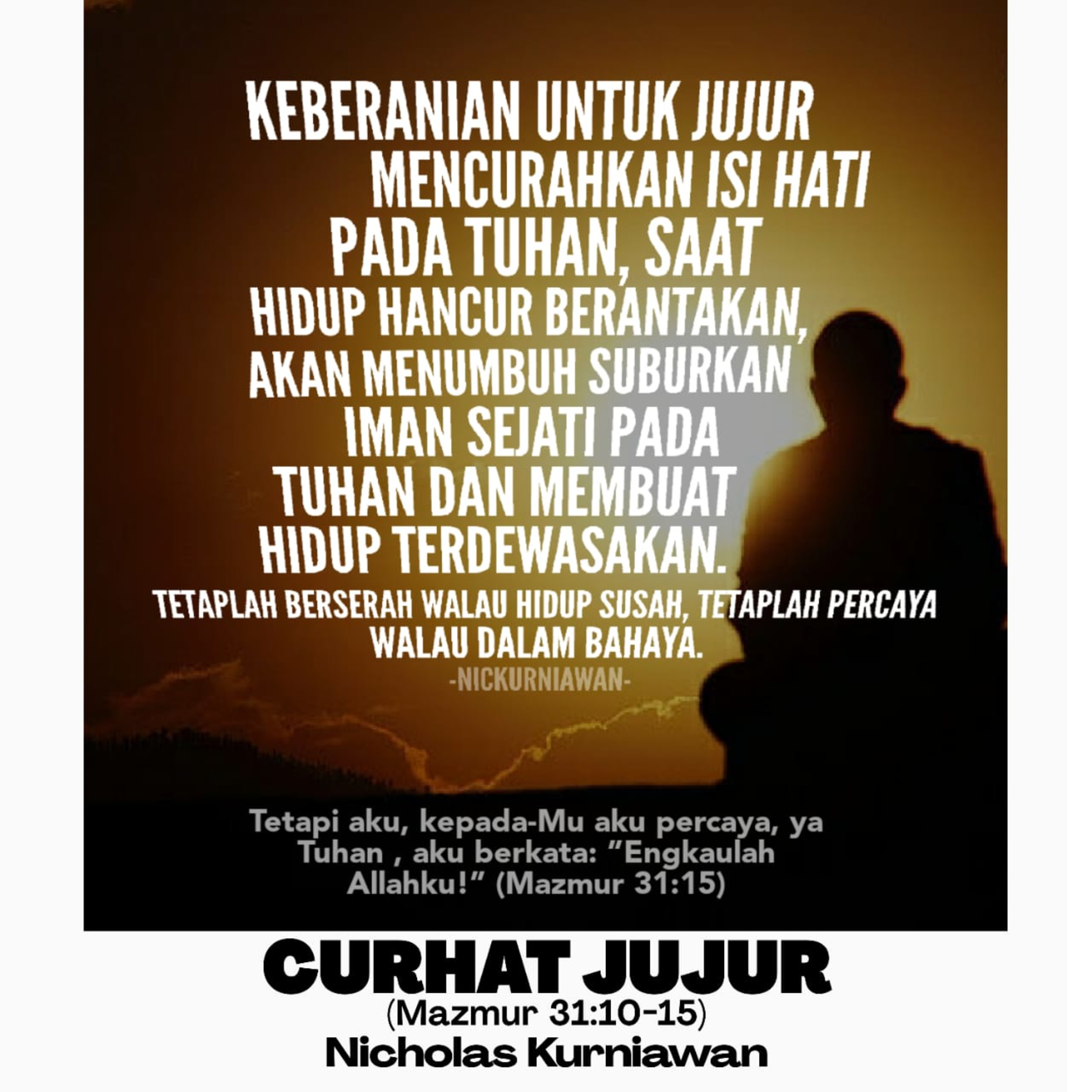 Sabda Tuhan hari ini membukakan hati kita untuk berani jujur seperti pemazmur, yang walaupun terluka, tetap terbuka mencurahkan segala susah hatinya dan lelah jiwanya; keberaniannya untuk jujur mengantarkannya pada iman sejati yang bertumbuh subur dan hidup yang terdewasakan melalui kesusahan. TETAPLAH BERSERAH WALAU HIDUP SEDANG SUSAH, TETAPLAH PERCAYA WALAU ADA DALAM BAHAYA.