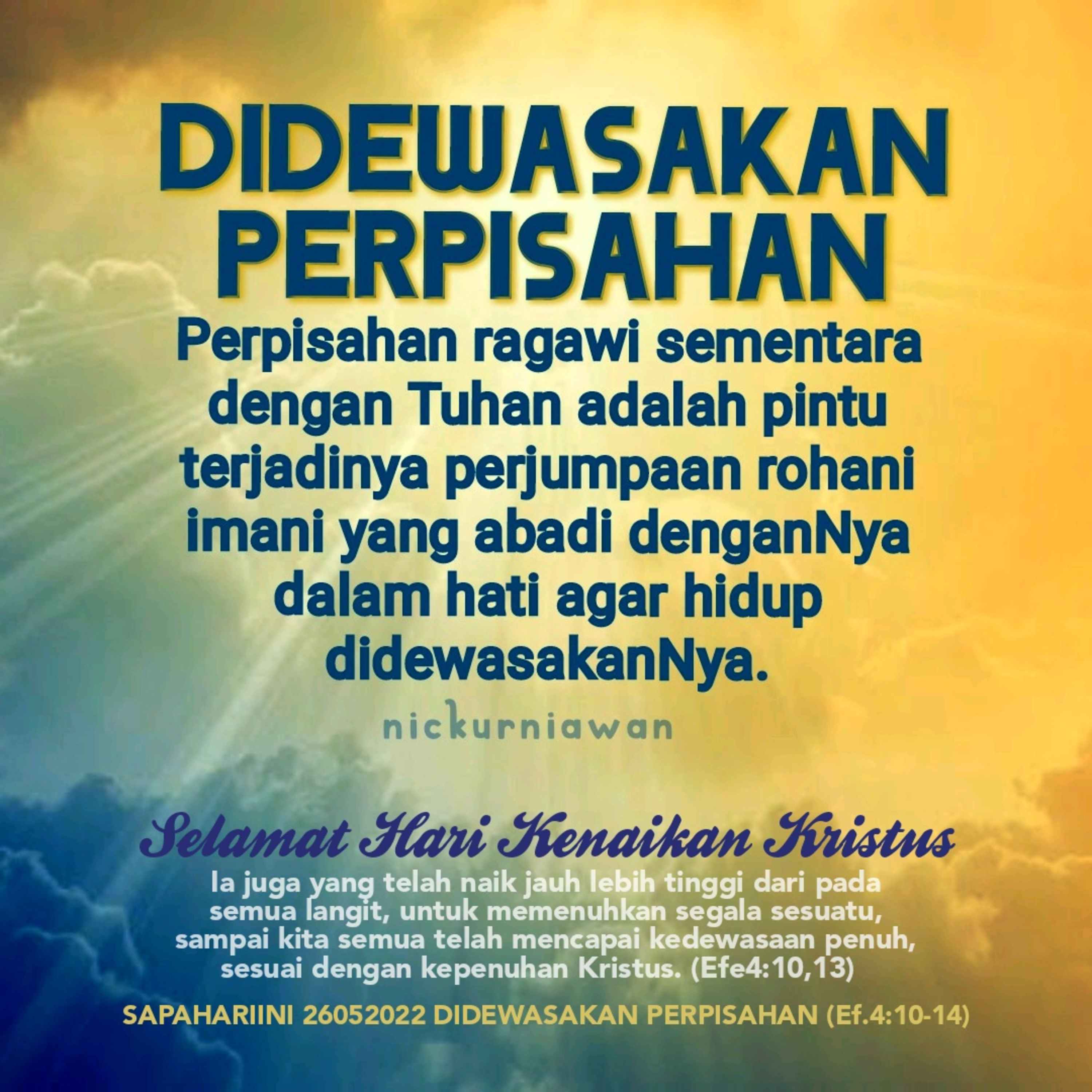 Sabda Tuhan mengajarkan lewat peristiwa kenaikan Kristus ke surga, bahwa perpisahan ragawi sementara dengan Tuhan adalah pintu terjadinya perjumpaan rohani imani yang abadi denganNya dalam hati agar hidup didewasakanNya.