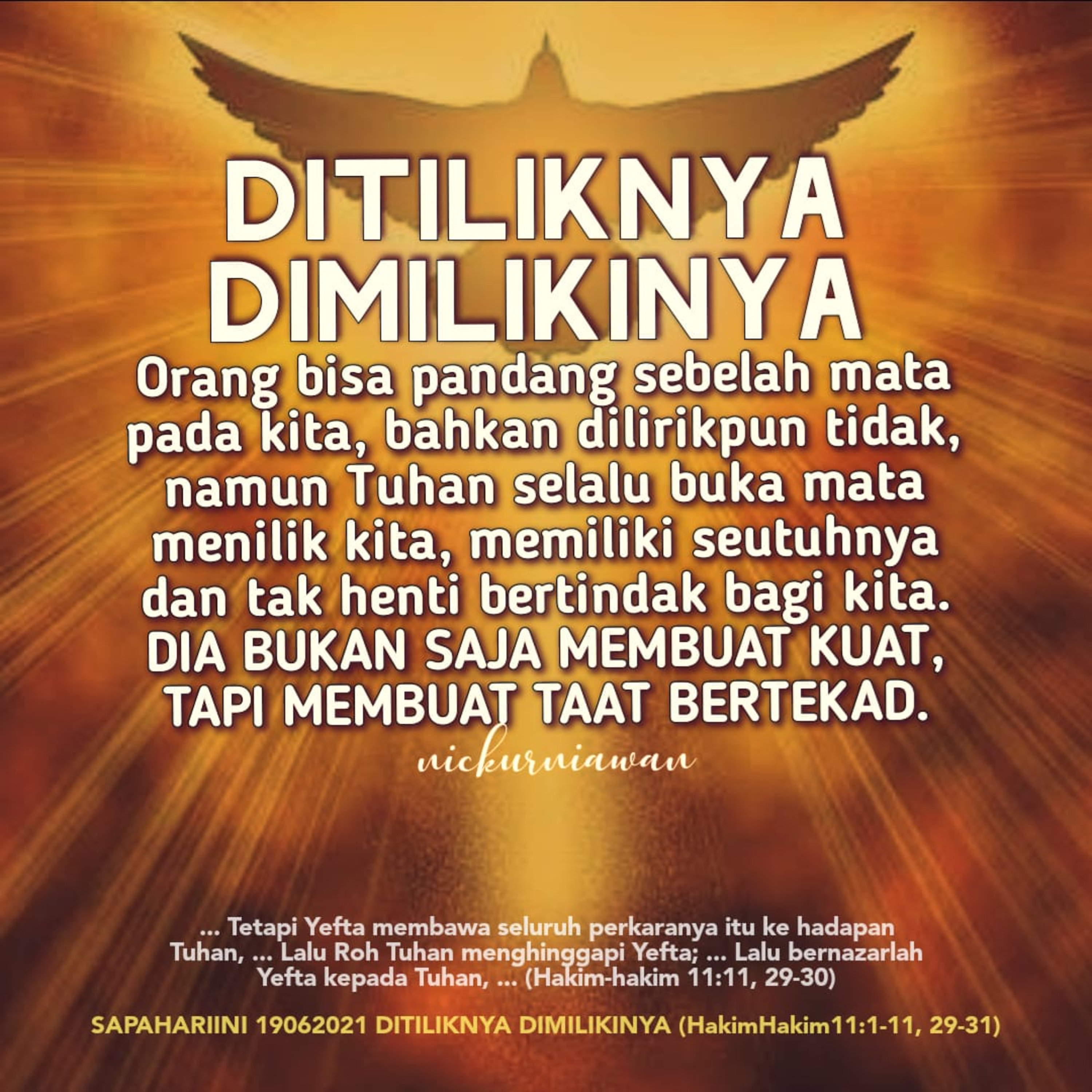 Sabda Tuhan dari karya RohNya atas Hakim Yefta yang dipakai Tuhan dalam misi Tuhan memerangi musuh Israel, menginspirasi kita bahwa orang bisa saja pandang sebelah mata pada kita, bahkan dilirikpun tidak, namun Tuhan selalu buka mata menilik kita, memiliki seutuhnya dan tak henti bertindak bagi kita. TUHAN BUKAN SAJA MEMBUAT KITA KUAT, TAPI MEMBUAT KITA TAAT BERTEKAD BAGINYA.