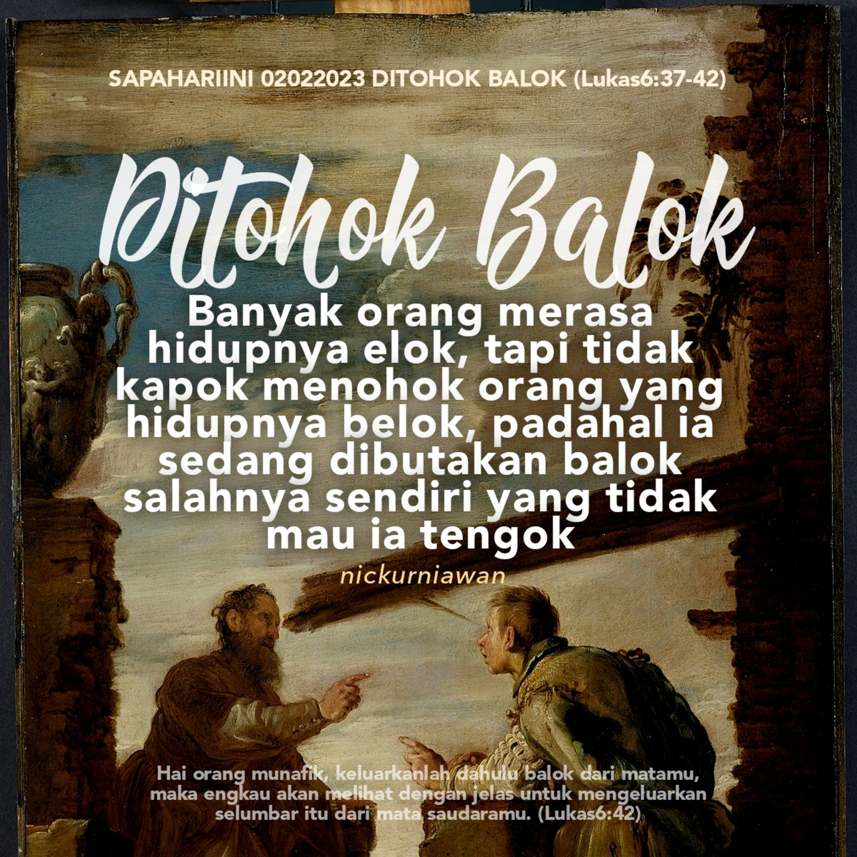 Sabda Tuhan menegur dan mengingatkan bahwa banyak orang merasa hidupnya elok, tapi tidak kapok menohok orang yang hidupnya belok, padahal ia sedang dibutakan 'balok' salahnya sendiri yang tidak mau ia tengok.