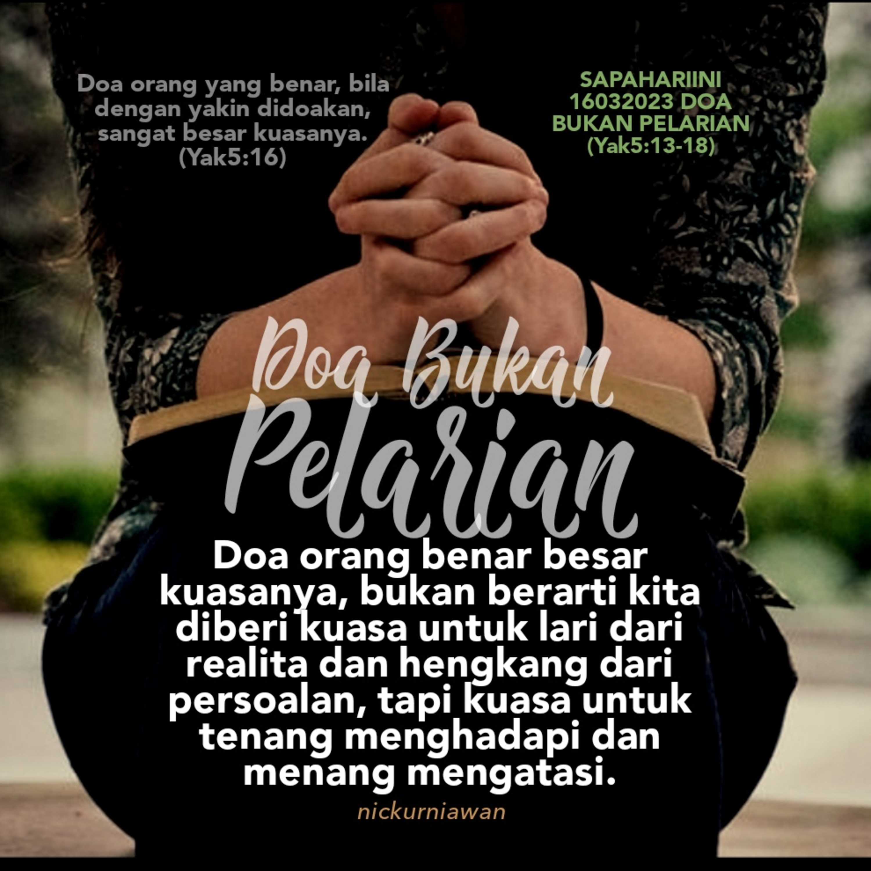 Sabda Tuhan mengingatkan bahwa doa orang benar besar kuasanya, bukan berarti orang benar diberi kuasa untuk lari dari realita dan hengkang dari persoalan, tapi kuasa untuk tenang menghadapi dan menang mengatasi bersamaNya.