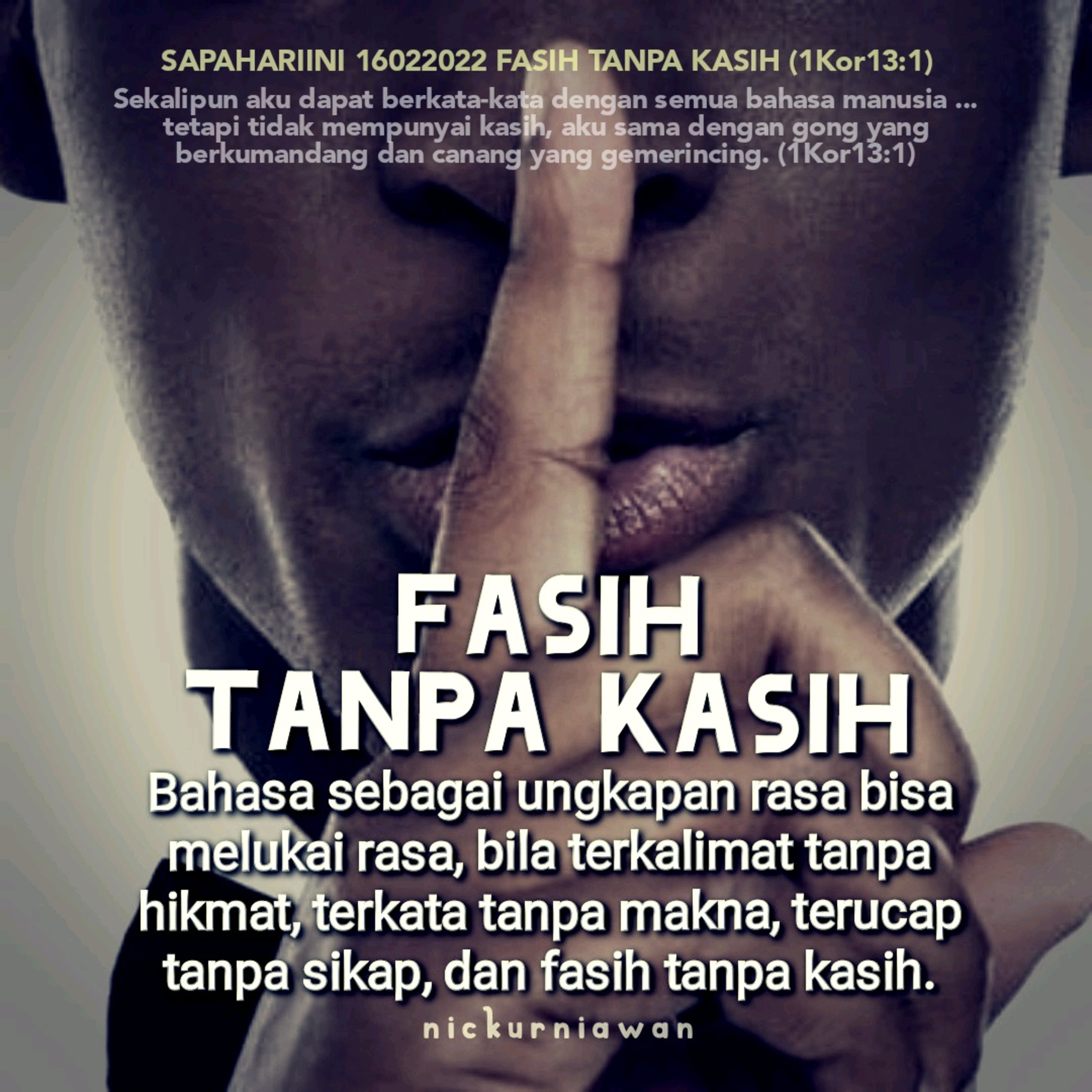 Sabda Tuhan tentang mengasihi dengan bijak menjelaskan bahwa bahasa sebagai ungkapan rasa bisa melukai rasa, bila terkalimat tanpa hikmat, terkata tanpa makna, terucap tanpa sikap, dan fasih tanpa kasih.