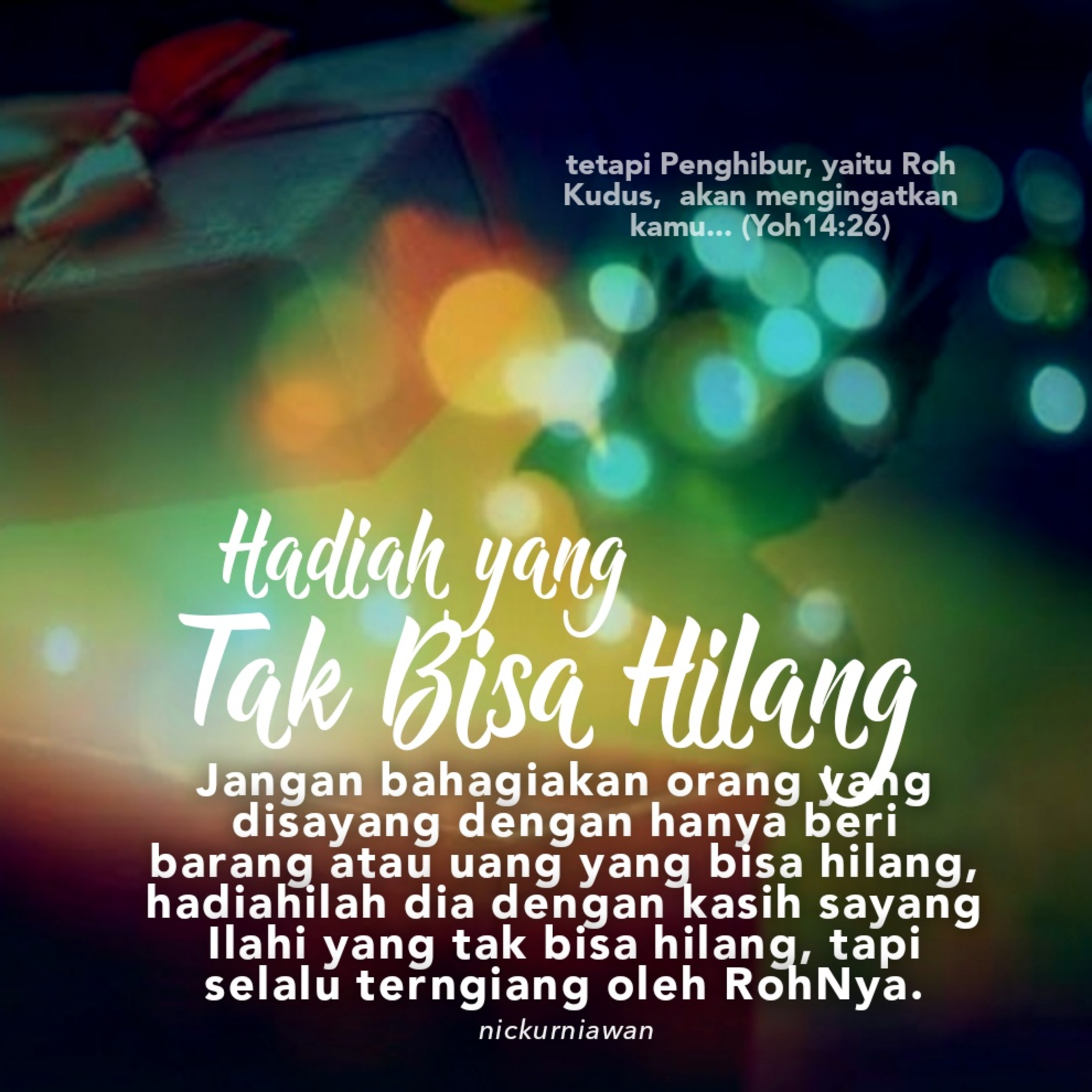 Sabda Tuhan mengajarkan untuk tidak bahagiakan orang tersayang dengan hanya beri barang atau uang yang bisa hilang, hadiahilah dia dengan kasih sayang Ilahi yang tak bisa hilang, tapi selalu terngiang dan tak henti dikenang oleh karya RohNya di dalam hati.