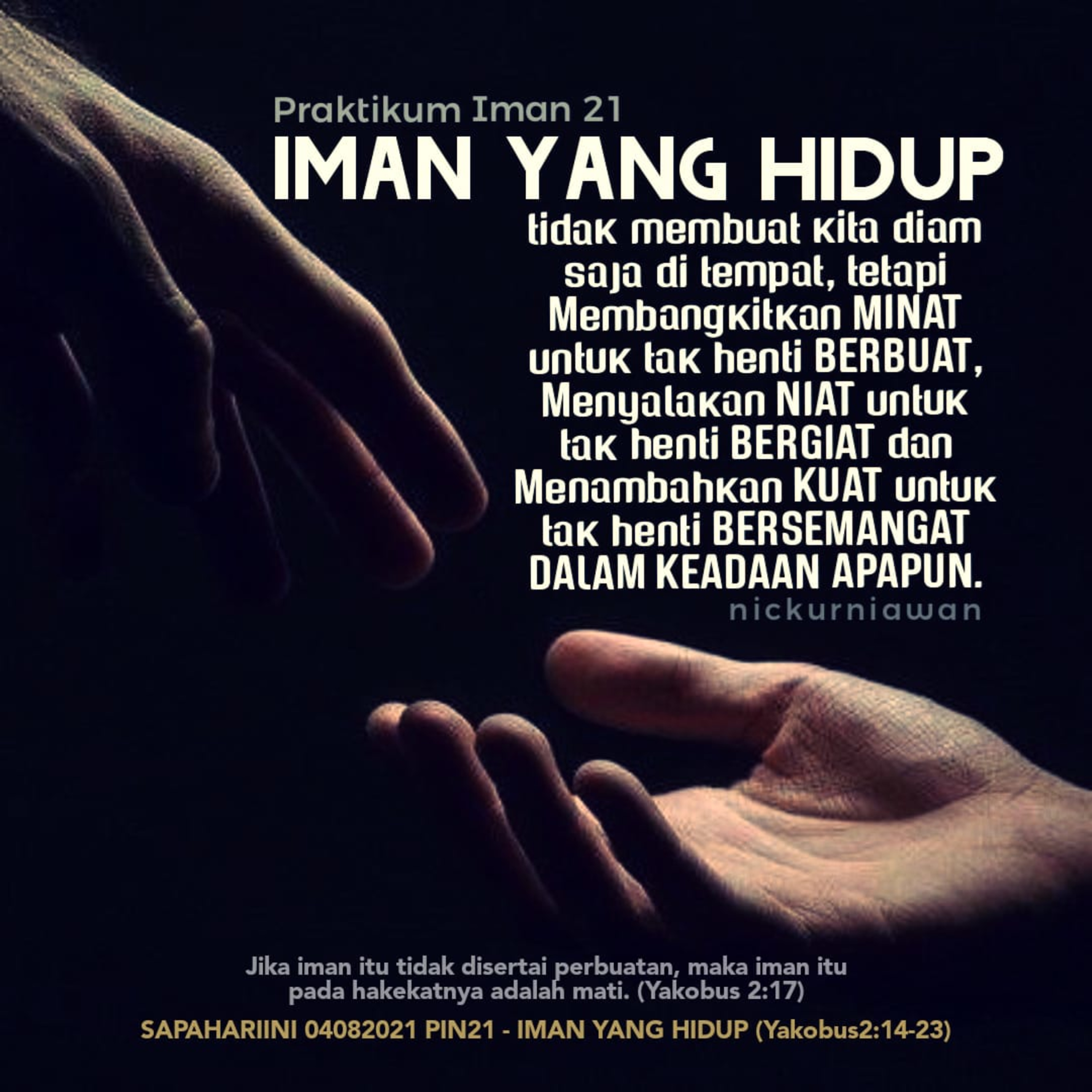 Sabda Tuhan ingin menggerakkan setiap orang beriman untuk bertindak dari iman percayanya karena IMAN YANG HIDUP tidak membuat kita diam saja di tempat, tetapi Membangkitkan MINAT untuk tak henti BERBUAT, Menyalakan NIAT untuk