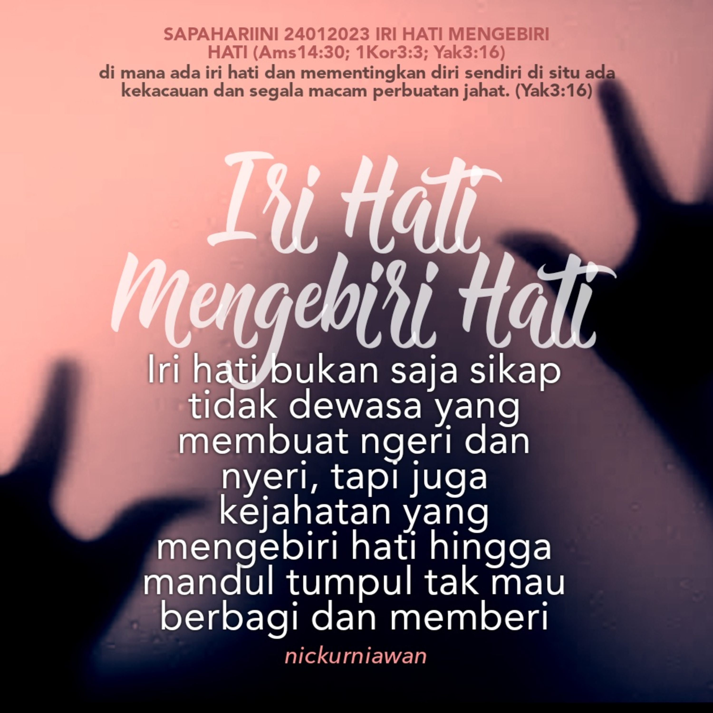 Sabda Tuhan mengingatkan tentang dosa di dalam hati manusia, yaitu iri hati yang bukan saja sikap tidak dewasa yang membuat ngeri dan nyeri, tapi juga kejahatan yang mengebiri hati hingga mandul tumpul tak mau berbagi dan memberi.