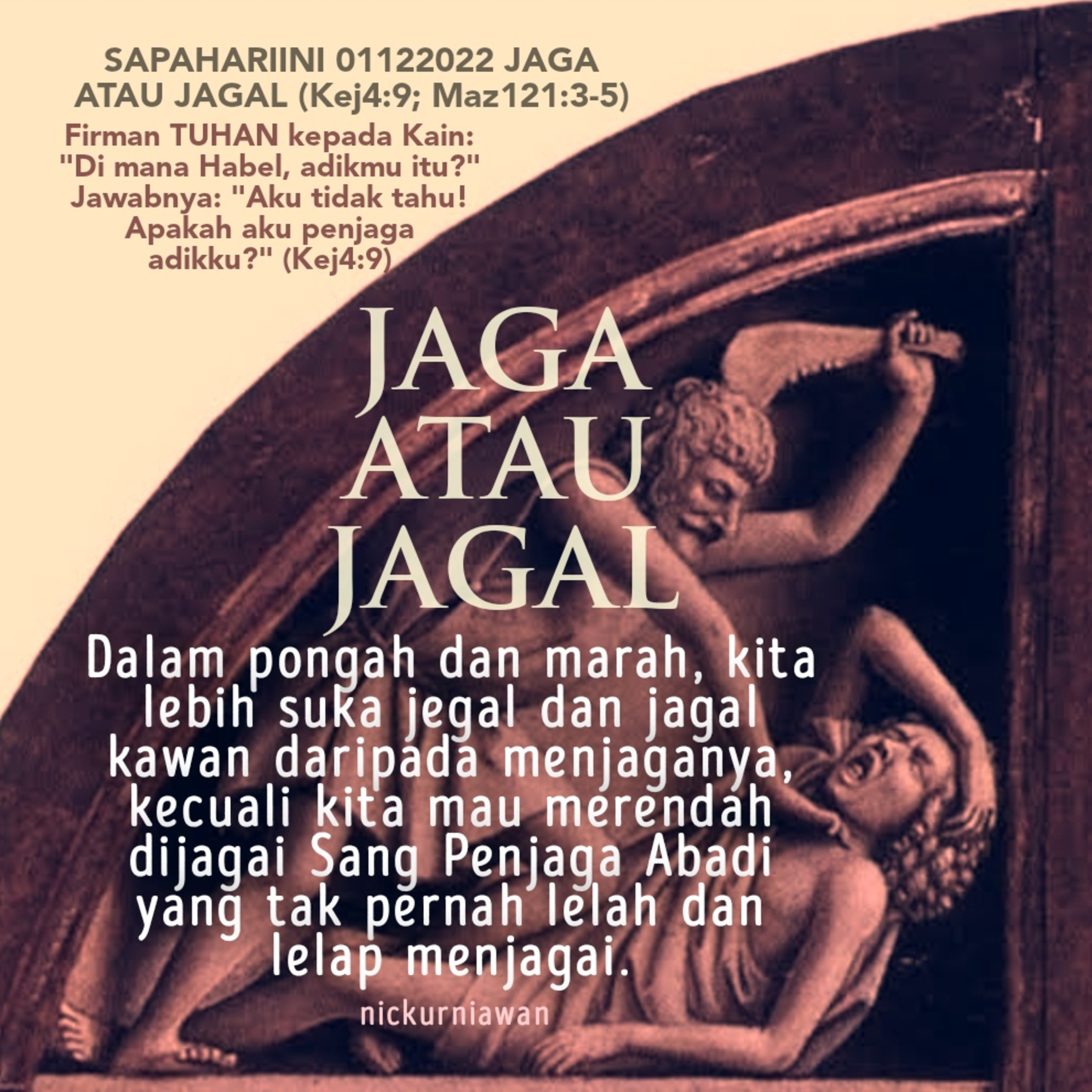 Sabda Tuhan mengingatkan dari kisah Kain dan Habil, bahwa dalam pongah dan marah, kita lebih suka jegal dan jagal kawan daripada menjaganya, kecuali kita mau merendah dijagai Sang Penjaga Abadi yang tak pernah lelah dan lelap menjagai.