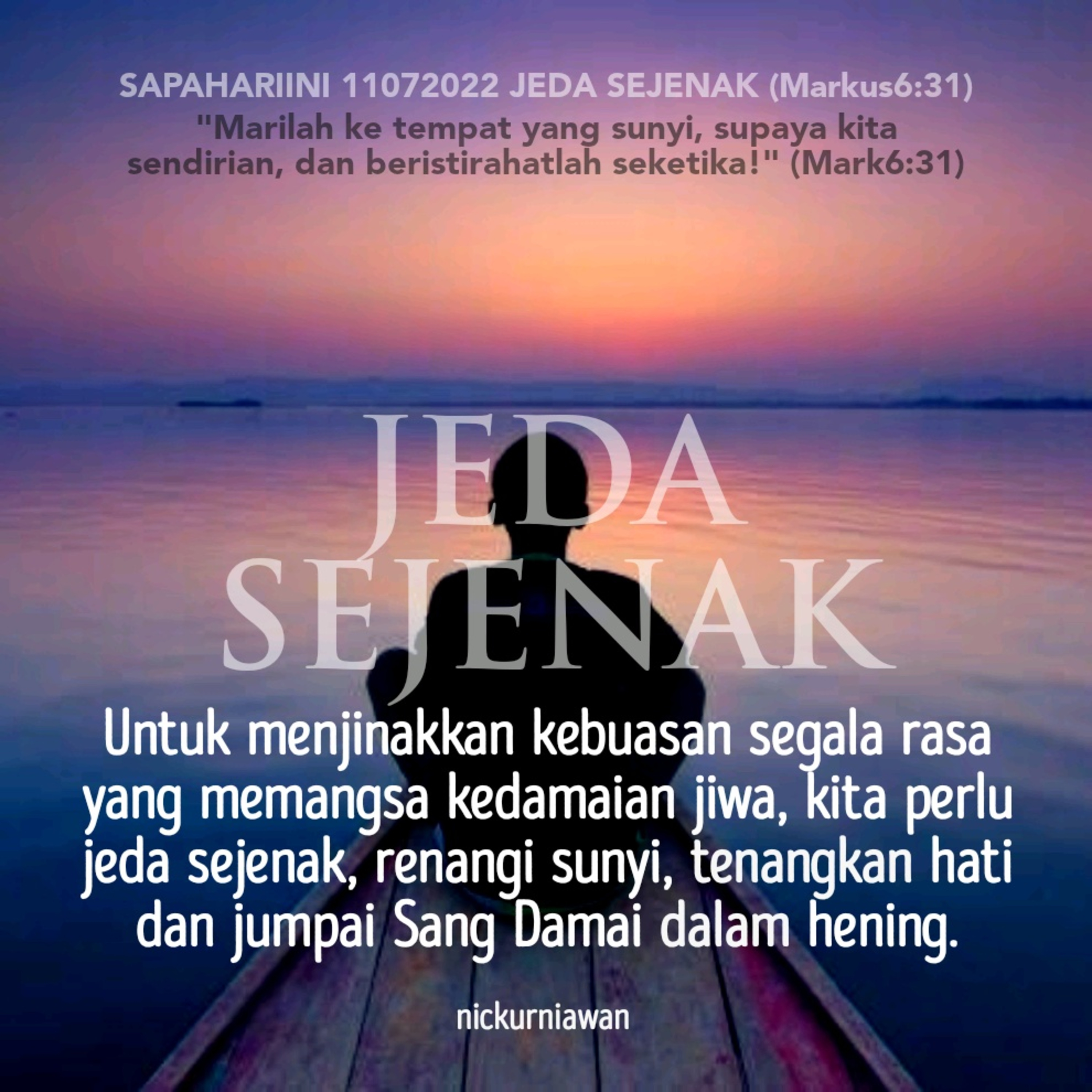 Sabda Tuhan mengajarkan kita bahwa untuk menjinakkan kebuasan segala rasa yang memangsa kedamaian jiwa, kita perlu jeda sejenak, renangi sunyi, tenangkan hati dan jumpai Sang Damai dalam hening.