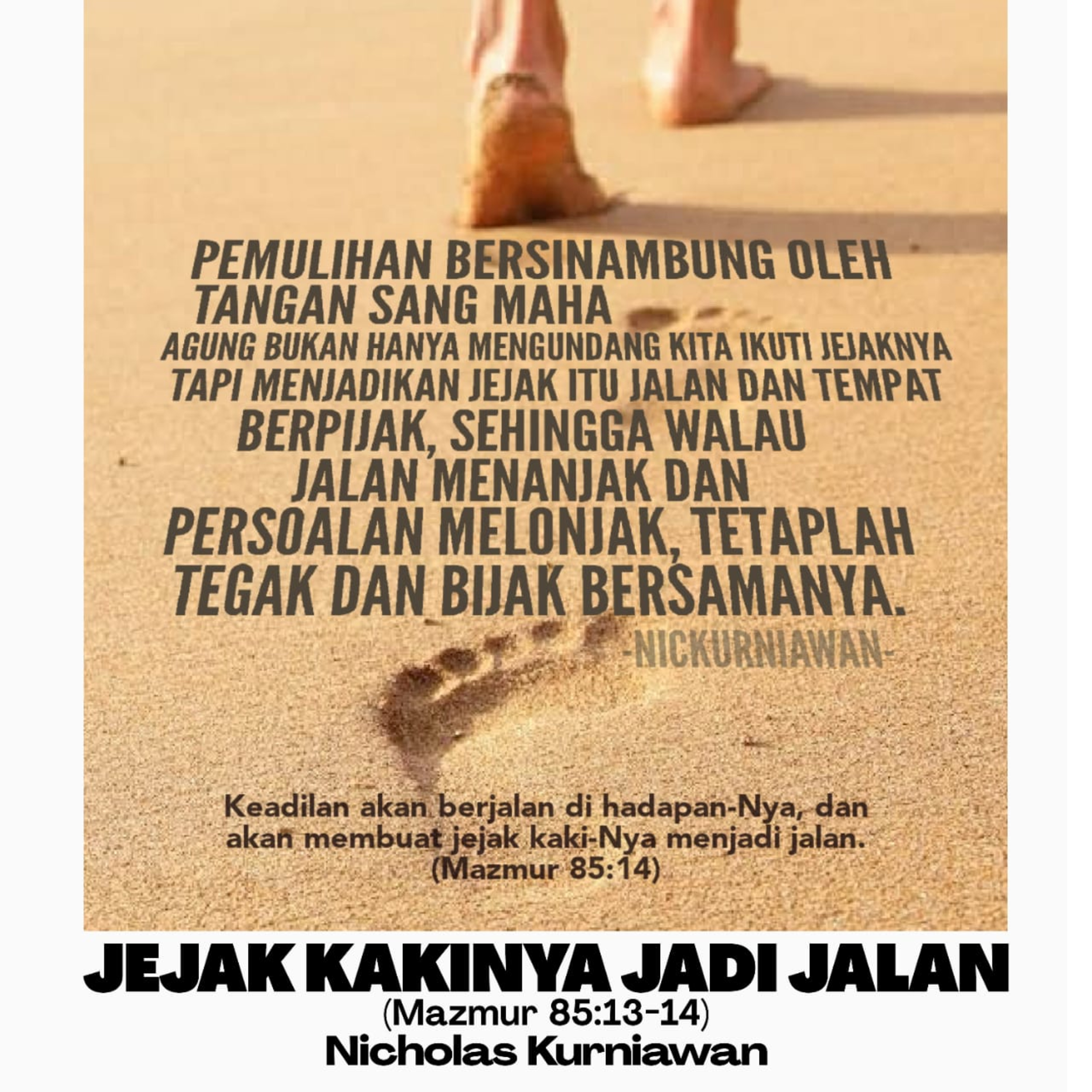 Sabda Tuhan mengajarkan lewat Mazmur Penantian Pemulihan, bahwa pemulihan yang Tuhan kerjakan itu bukan langsung jadi atau sekali jadi lalu usai, tapi terjadi secara berangsur dan bersinambung tanpa henti oleh Sang Maha Agung yang kasihNya tak terbendung, sanggup membuat yang limbung jadi melambung lagi, yang sedih berkabung jadi fasih bergabung; Dia bukan hanya mengundang kita ikuti jejakNya tapi menjadikan jejak itu jalan dan tempat kita berpijak, sehingga walau jalan menanjak dan persoalan melonjak, tetap sanggup tegak dan bijak bersamaNya.