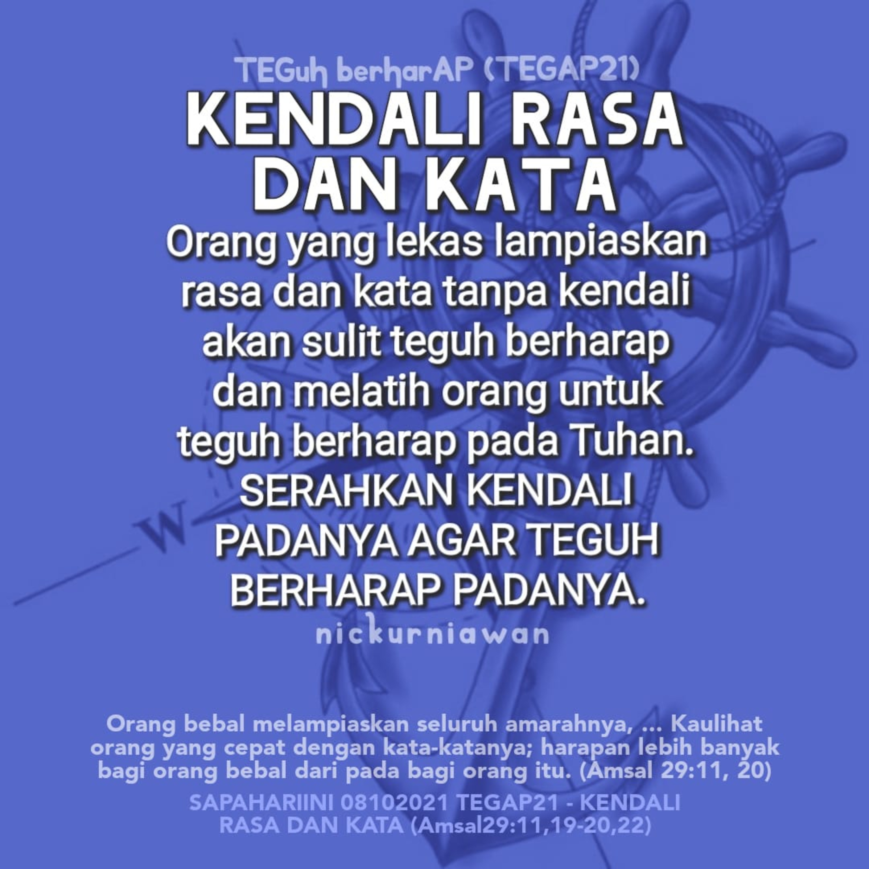 Sabda Tuhan mengingatkan kembali tentang kendala bagi orang yang ingin teguh berharap kepada Tuhan, bahwa orang yang lekas ungkapkan rasa dan kata tanpa kendali akan sulit teguh berharap dan melatih orang untuk teguh berharap pada Tuhan. SERAHKAN KENDALI PADANYA AGAR TEGUH BERHARAP PADANYA.