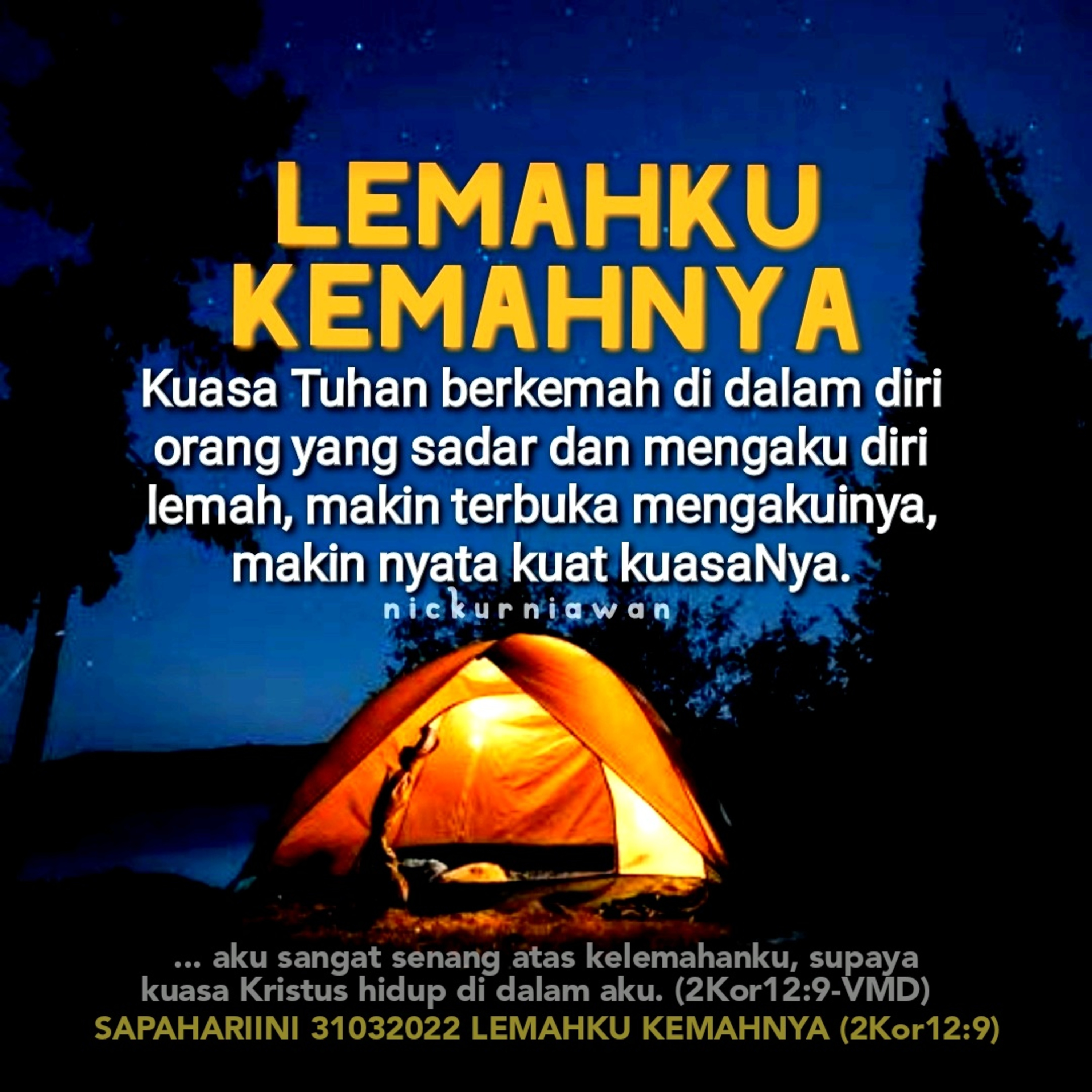 Sabda Tuhan mengajarkan tentang prasyarat agar kuasa Tuhan 'berkemah' di dalam diri orang percaya, yaitu sadar dan mengaku diri lemah, makin terbuka ia mengakuinya, makin nyata kuat kuasaNya di dalam dan melaluinya.