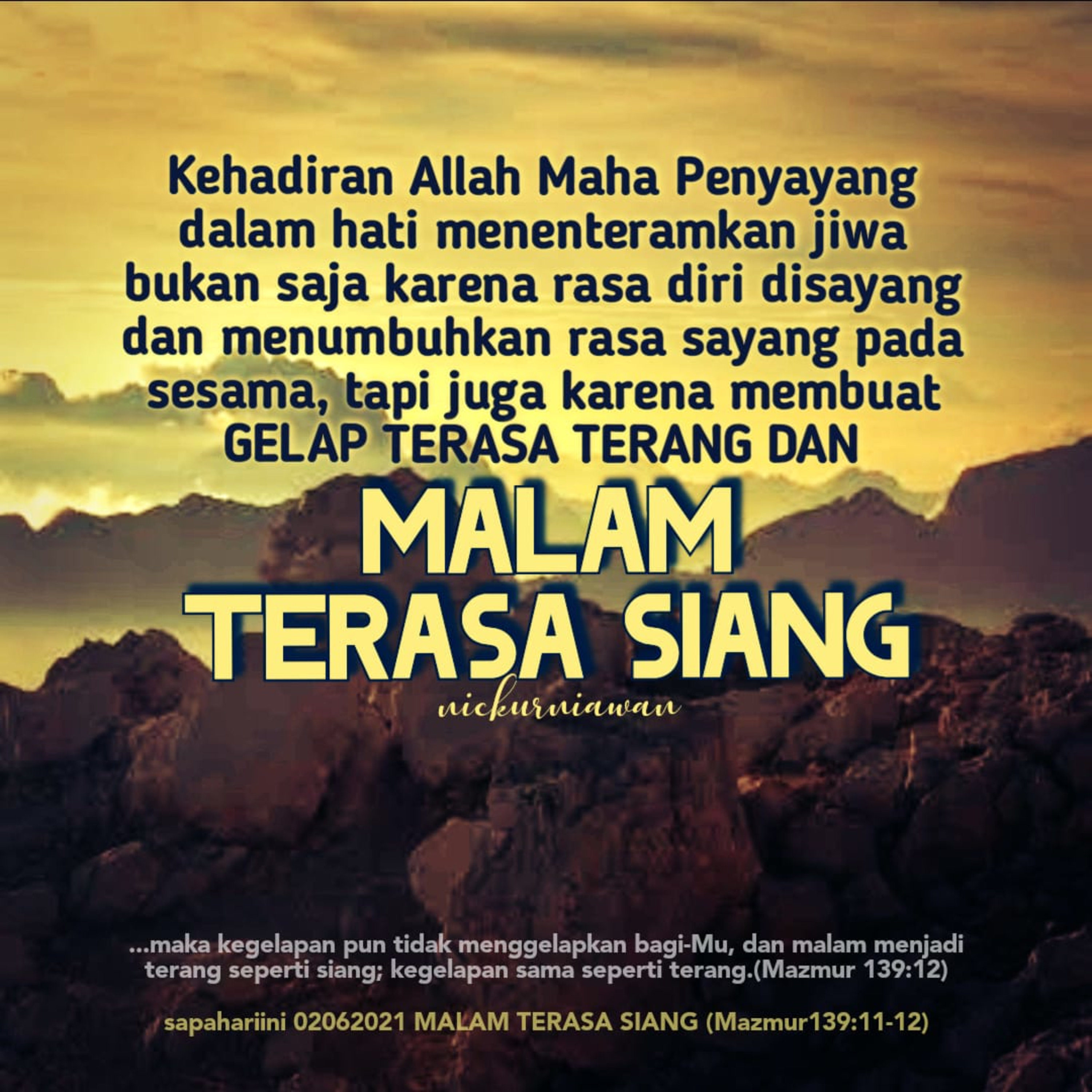 Sabda Allah menyapa dari doa keyakinan Daud kepada Allahnya yang ingin menegaskan bahwa Kehadiran Allah Maha Penyayang di dalam hati kita sanggup menenteramkan jiwa bukan saja karena rasa diri disayang dan menumbuhkan rasa sayang pada sesama, tapi juga karena membuat gelap terasa terang dan malam terasa siang.