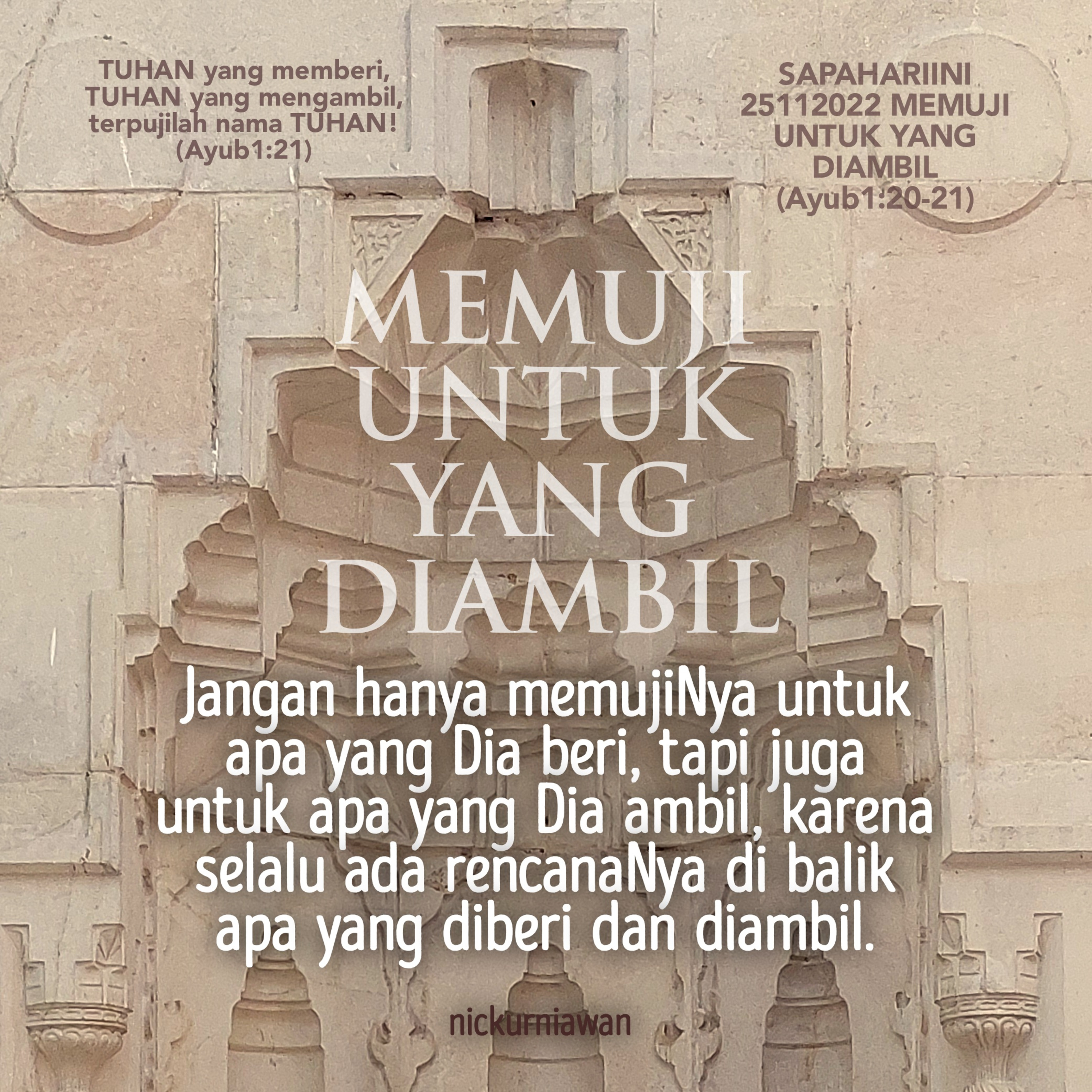 Sabda Tuhan mengajarkan untuk memujiNya dalam segala hal, jangan hanya memujiNya untuk apa yang Dia beri, tapi juga untuk apa yang Dia ambil, karena segalanya Dia yang punya dan selalu ada rencanaNya di balik apa yang diberi dan diambil.