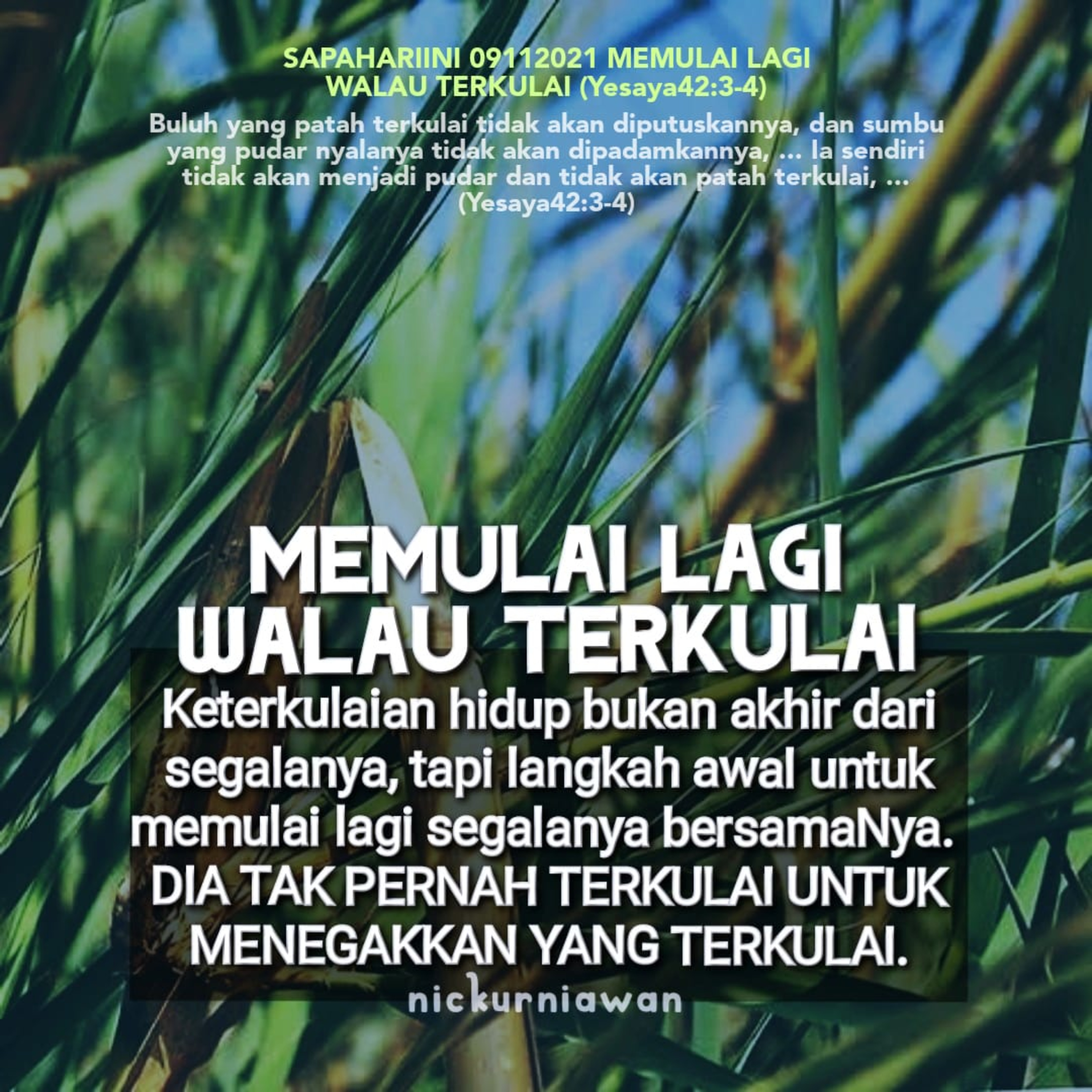 Sabda Tuhan penyemangat kuat untuk memulai kembali setelah mengalami berbagai problema hidup ingin menjelaskan bahwa keterkulaian hidup bukan akhir dari segalanya, tapi langkah awal untuk memulai lagi segalanya bersamaNya. DIA TAK PERNAH TERKULAI UNTUK MENEGAKKAN YANG TERKULAI.