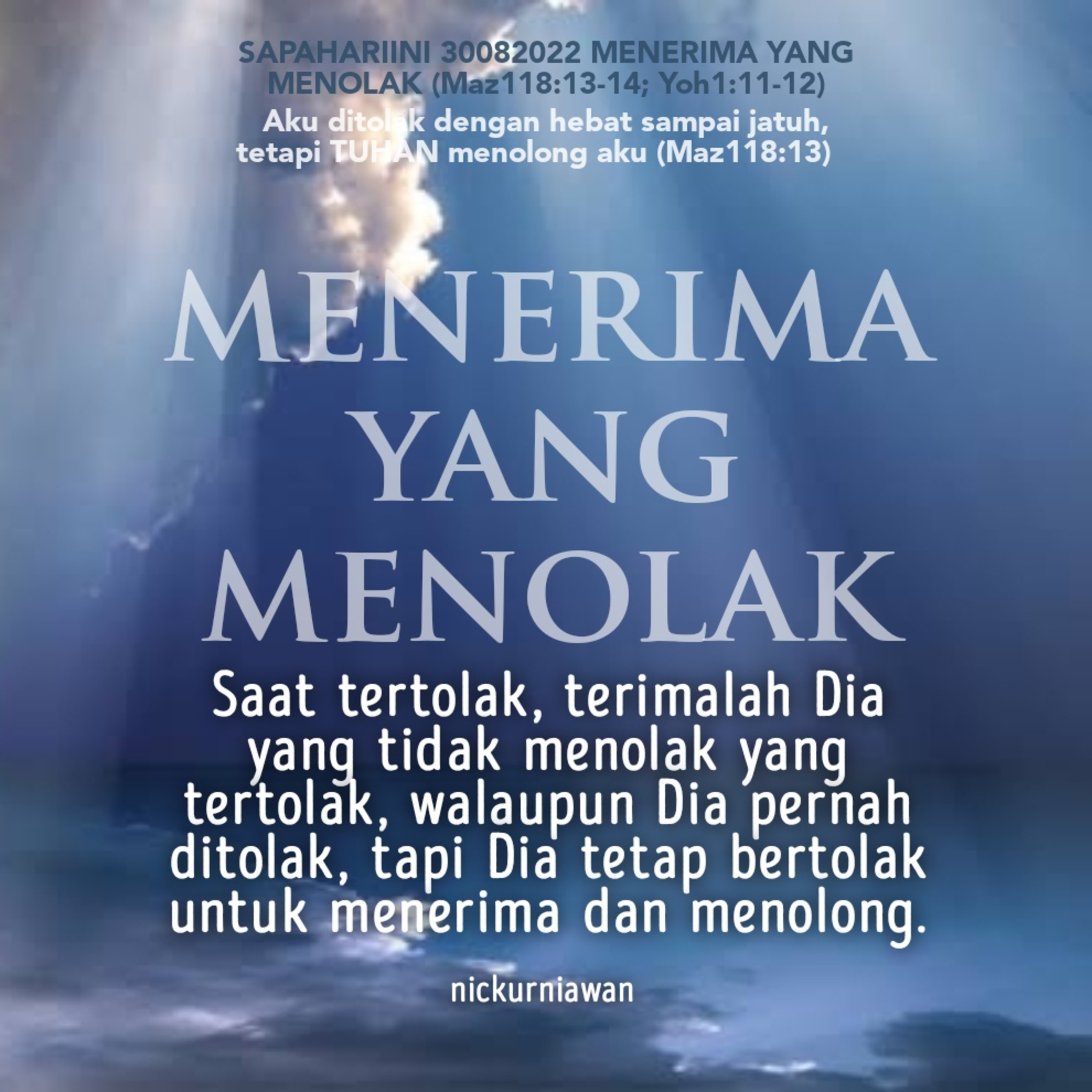 Sabda Tuhan menguatkan mereka yang pernah hadapi penolakan, bahwa saat kita tertolak, terimalah Dia yang tidak pernah menolak yang tertolak, walaupun Dia pernah ditolak, tapi Dia tetap bertolak untuk menerima dan menolong mereka yang tertolak dan yang menolakNya.