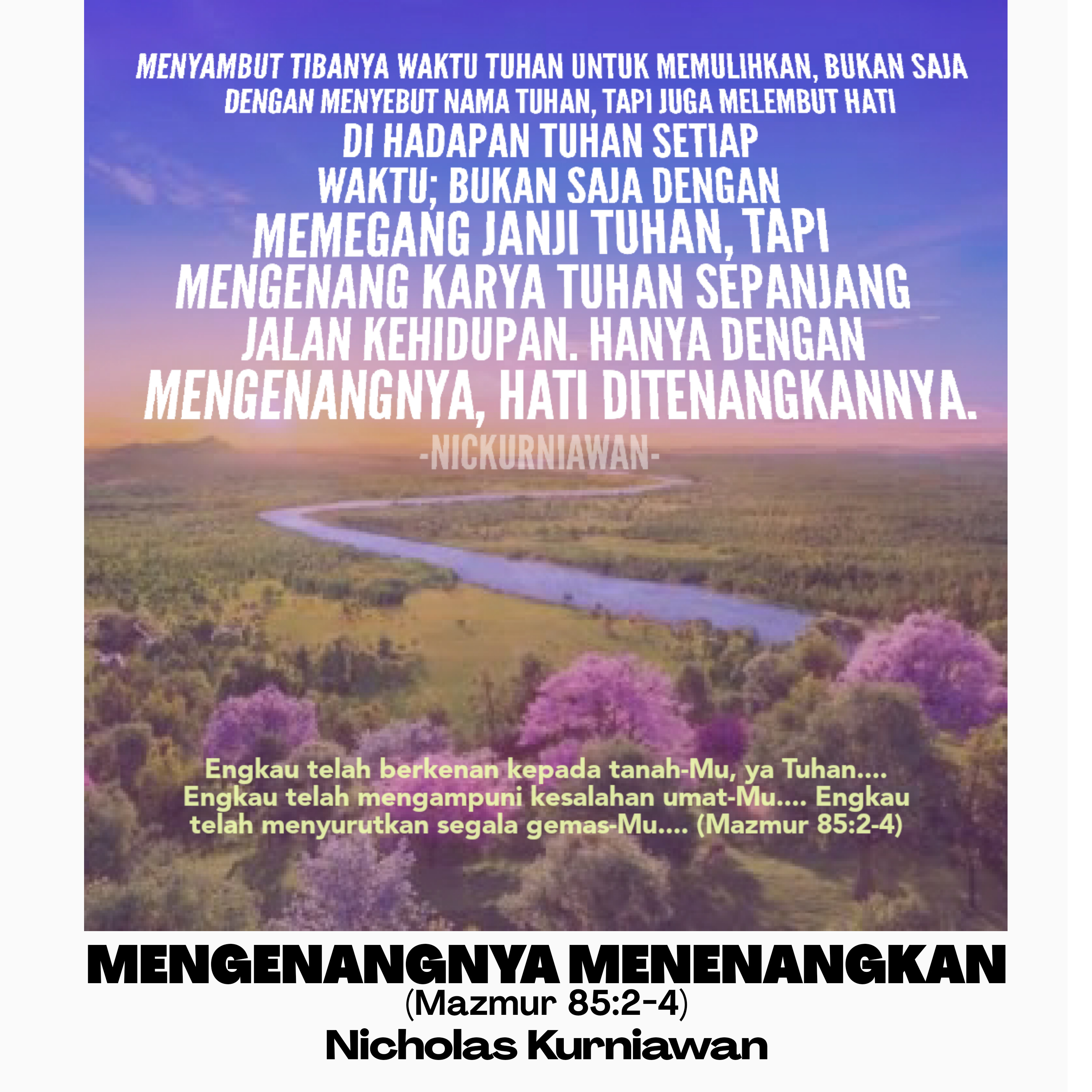 Sabda Tuhan dari Mazmur 85 berisi tentang penantian dan persiapan menyambut pemulihan Tuhan terjadi, dimana untuk menyambutnya, orang percaya bertugas bukan hanya menyebut nama Tuhan tapi melembut hati di hadapan Tuhan setiap waktu dan bukan hanya memegang janji Tuhan tapi mengenang karya Tuhan sepanjang jalan kehidupan yang sudah berlangsung, karena hanya DENGAN MENGENANGNYA, JIWA KITA DITENANGKANNYA.